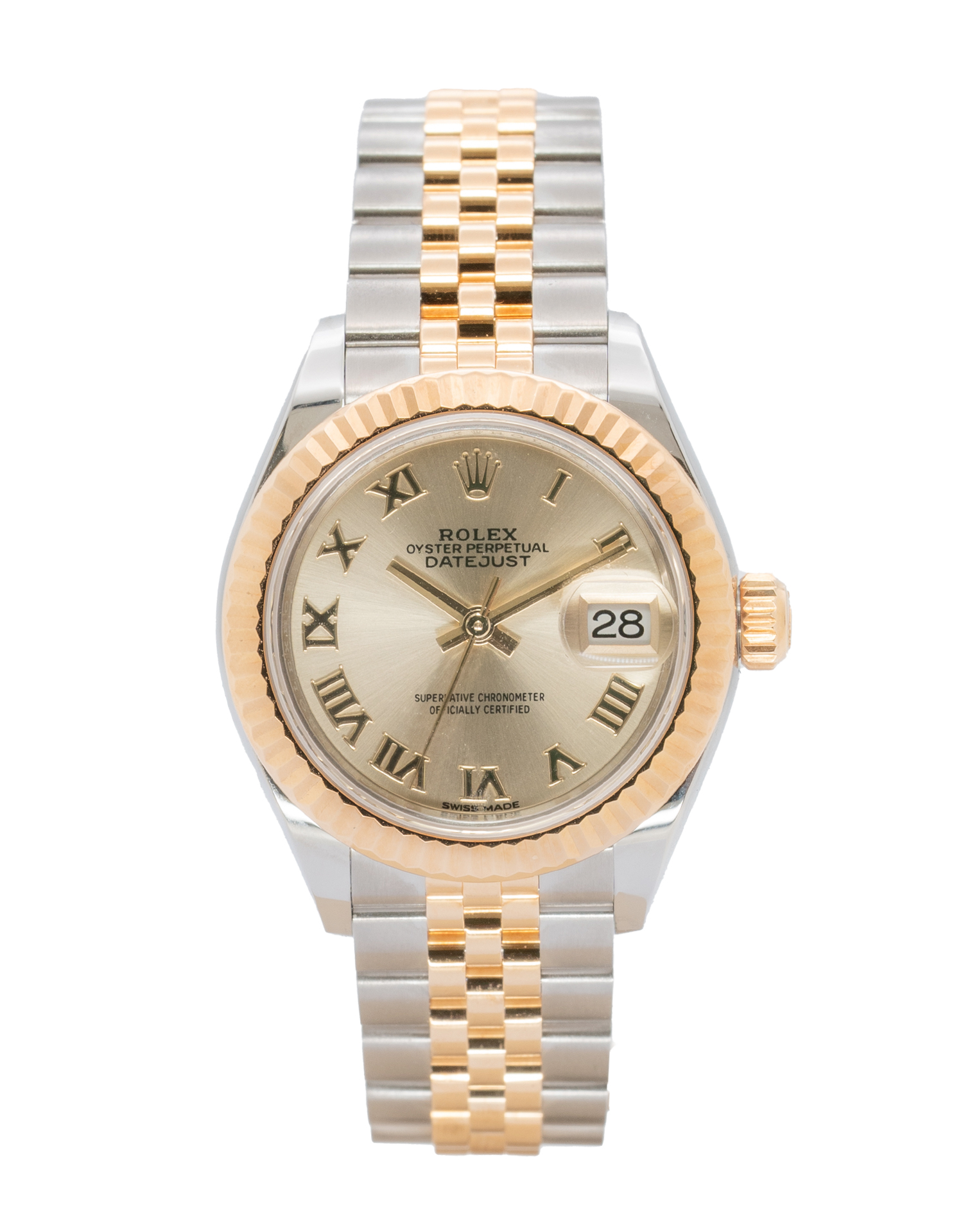 This Rolex Datejust Lady 28 279173 has a champagne roman numeral dial and a bracelet strap. This Rolex has undergone a thorough inspection of water resistance, accuracy, functionality and condition to determine the level of reconditioning required to meet our strict standards. It has also been referenced against technical documents and manufacturer records where available to ensure authenticity and a clean history. All our watches have a 24-month warranty for your peace of mind. One of our skilled polishing technicians has removed marks on the case and bracelet of this watch, brought about by daily wear and tear, which is why this watch does not come with the remaining manufacturer’s warranty.