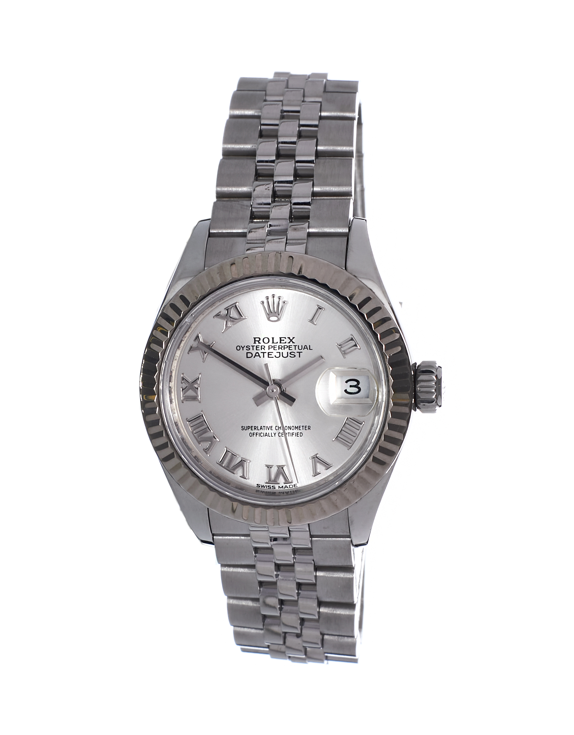 This Rolex Datejust Lady 28 279174 has a silver roman numeral dial and a bracelet strap. This Rolex has undergone a thorough inspection of water resistance, accuracy, functionality and condition to determine the level of reconditioning required to meet our strict standards. It has also been referenced against technical documents and manufacturer records where available to ensure authenticity and a clean history. All our watches have a 24-month warranty for your peace of mind. One of our skilled polishing technicians has removed marks on the case and bracelet of this watch, brought about by daily wear and tear, which is why this watch does not come with the remaining manufacturer’s warranty.