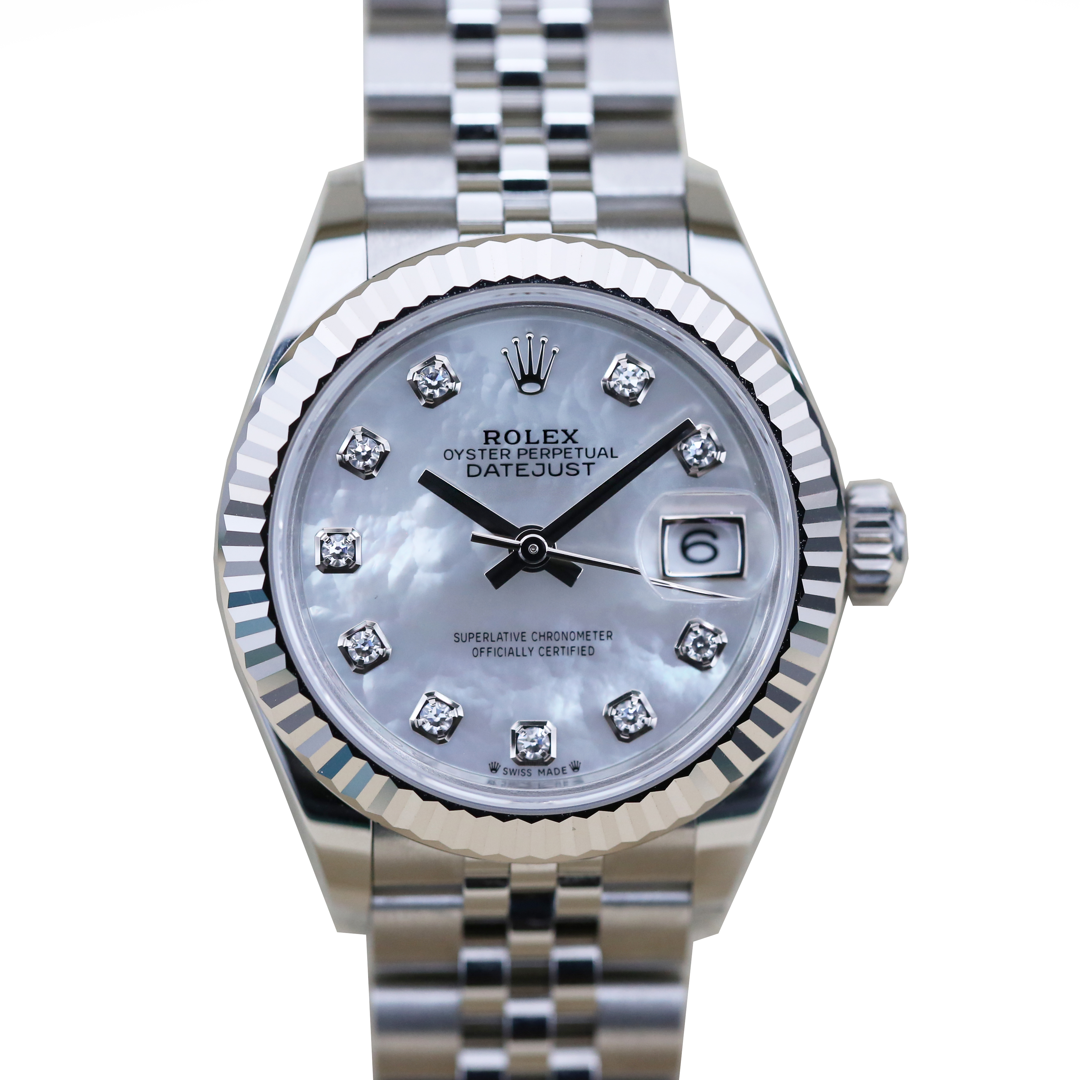 This Rolex Datejust Lady 28 279174 has a mother of pearl white - diamond dial and a bracelet strap. This Rolex has undergone a thorough inspection of water resistance, accuracy, functionality and condition to determine the level of reconditioning required to meet our strict standards. It has also been referenced against technical documents and manufacturer records where available to ensure authenticity and a clean history. Our watches have a 24-month warranty for your peace of mind, in conjunction with any remaining manufacturer’s warranty from new or from service. To maintain the manufacturer’s warranty on this watch, it has not been polished in our service centre.