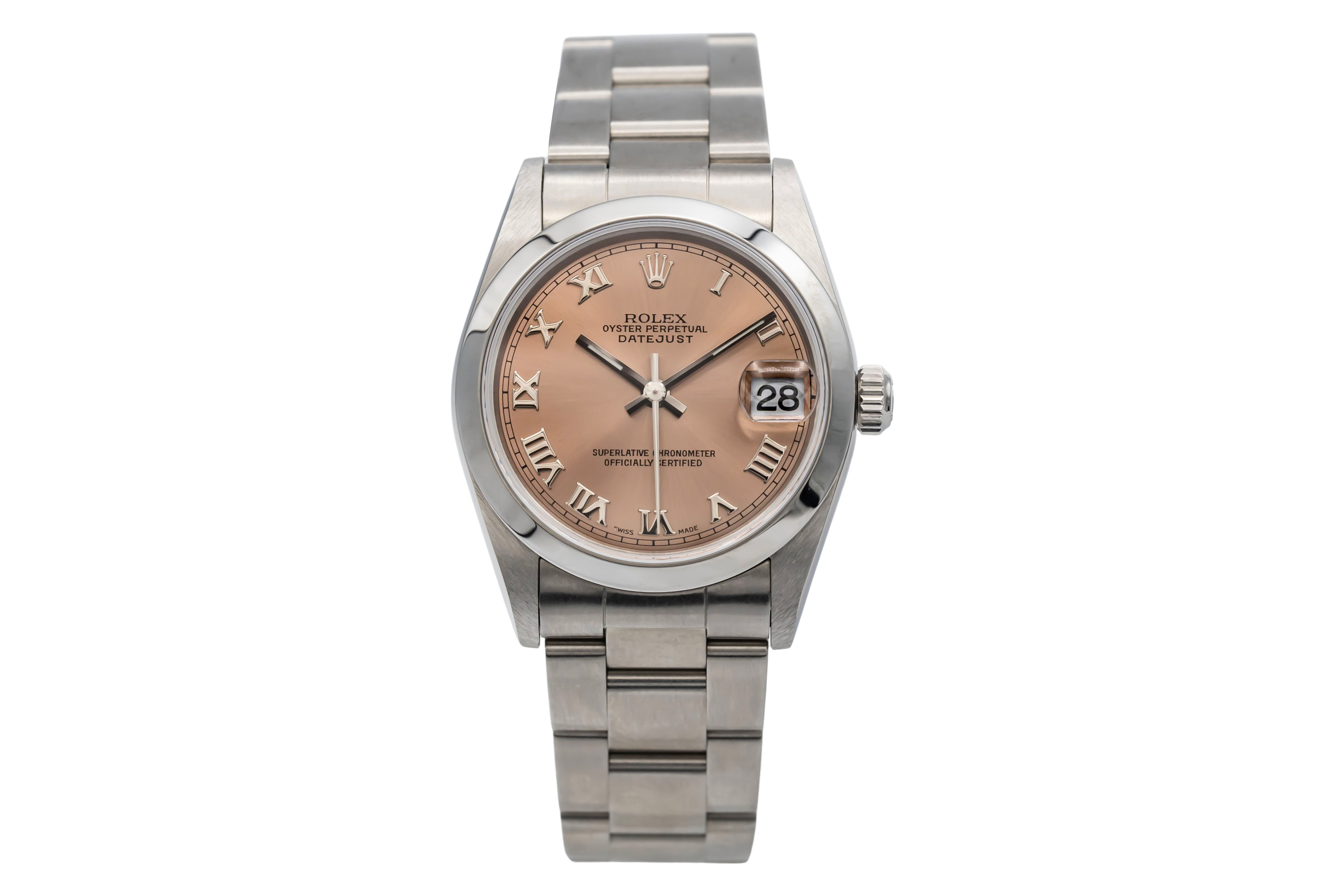 This Rolex Datejust Lady 31 178240 has a pink roman numeral dial and a bracelet strap. This Rolex has undergone a thorough inspection of water resistance, accuracy, functionality and condition to determine the level of reconditioning required to meet our strict standards. It has also been referenced against technical documents and manufacturer records where available to ensure authenticity and a clean history. All our watches have a 24-month warranty for your peace of mind. One of our skilled polishing technicians has removed marks on the case and bracelet of this watch, brought about by daily wear and tear, which is why this watch does not come with the remaining manufacturer’s warranty.