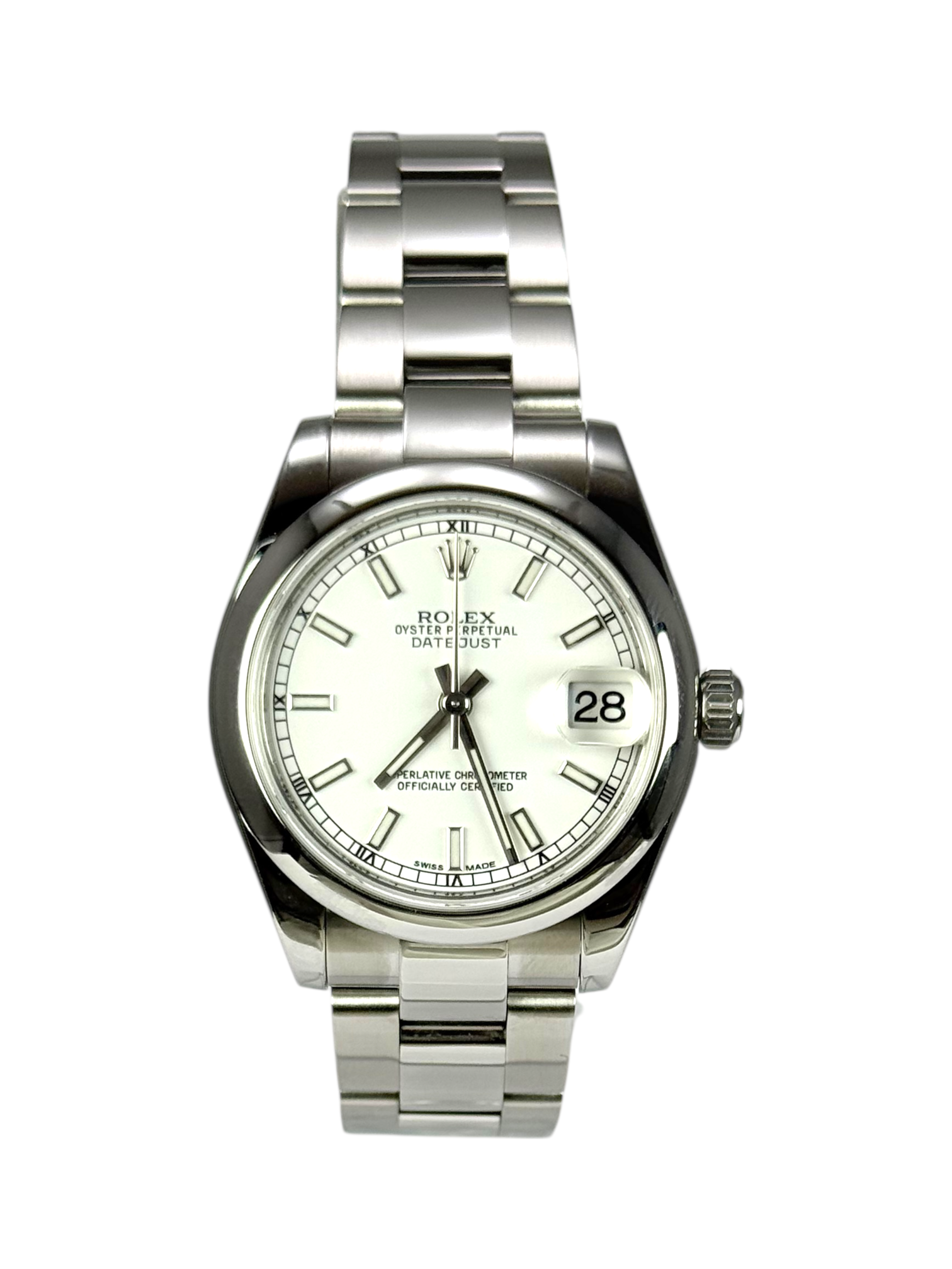This Rolex Datejust Lady 31 178240 has a white baton dial and a bracelet strap. This Rolex has undergone a thorough inspection of water resistance, accuracy, functionality and condition to determine the level of reconditioning required to meet our strict standards. It has also been referenced against technical documents and manufacturer records where available to ensure authenticity and a clean history. All our watches have a 24-month warranty for your peace of mind. One of our skilled polishing technicians has removed marks on the case and bracelet of this watch, brought about by daily wear and tear, which is why this watch does not come with the remaining manufacturer’s warranty.