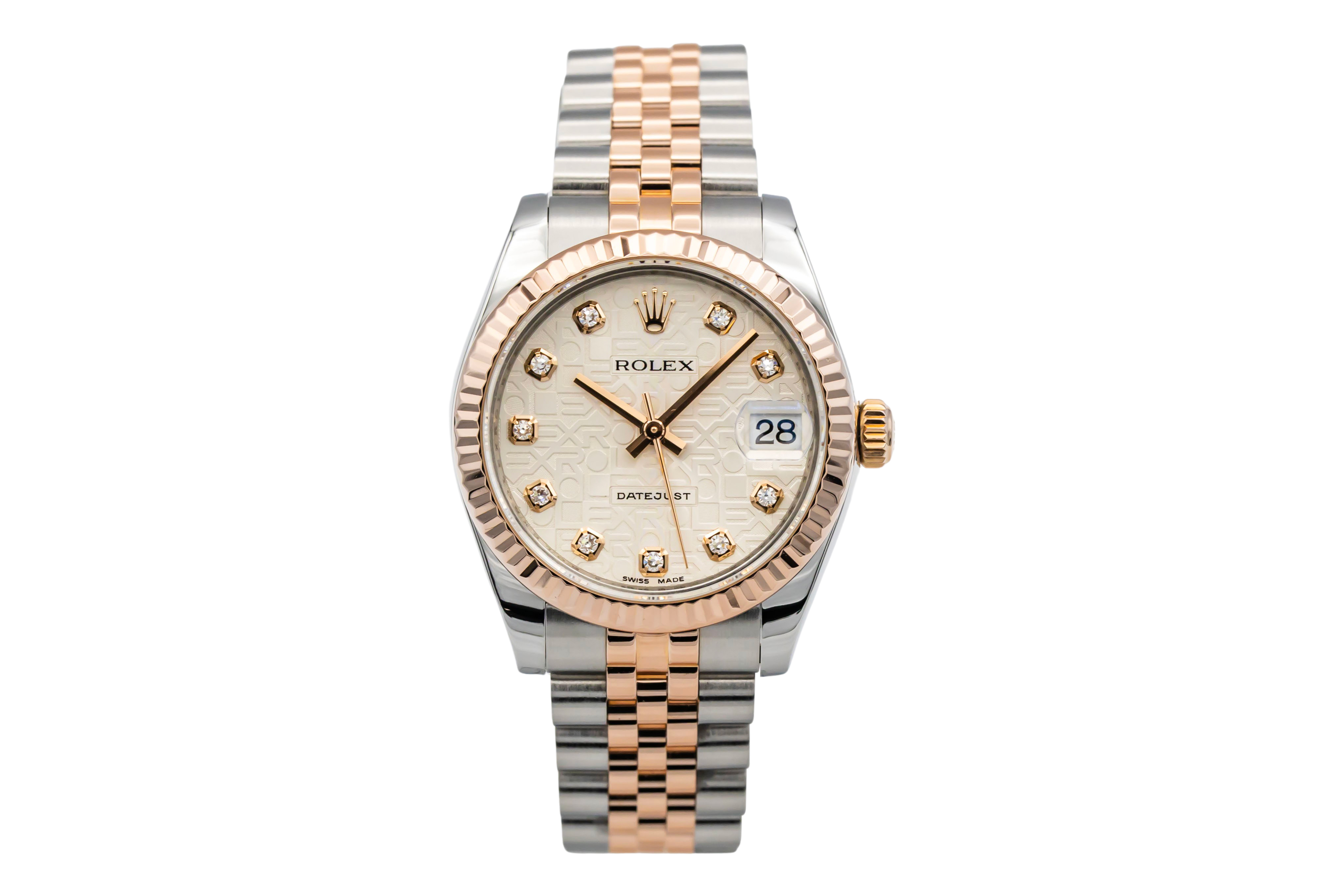 This Rolex Datejust Lady 31 178271 has a silver jubilee diamond dial and a bracelet strap. This Rolex has undergone a thorough inspection of water resistance, accuracy, functionality and condition to determine the level of reconditioning required to meet our strict standards. It has also been referenced against technical documents and manufacturer records where available to ensure authenticity and a clean history. All our watches have a 24-month warranty for your peace of mind. One of our skilled polishing technicians has removed marks on the case and bracelet of this watch, brought about by daily wear and tear, which is why this watch does not come with the remaining manufacturer’s warranty.