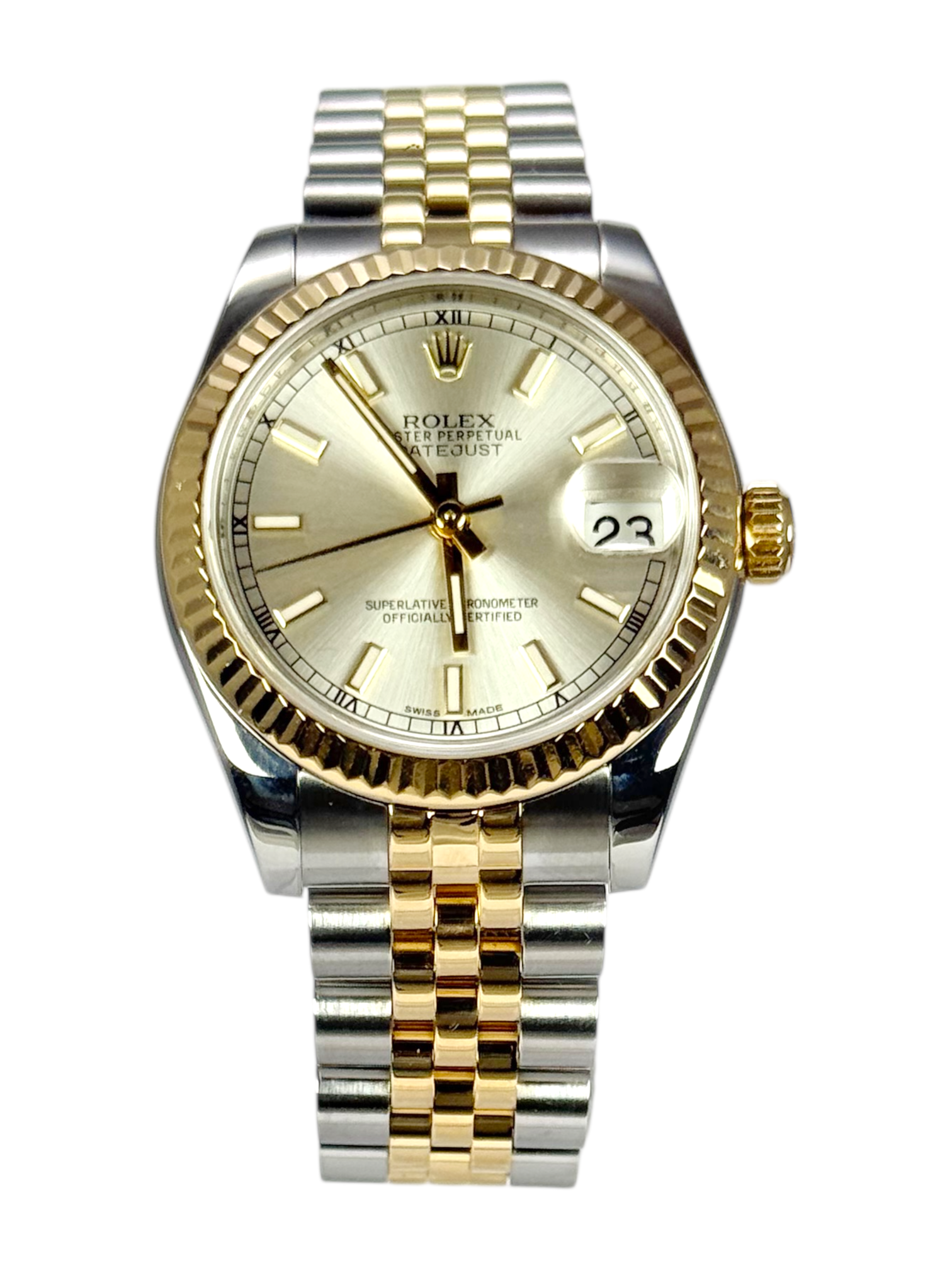 This Rolex Datejust Lady 31 178273 has a champagne baton dial and a bracelet strap. This Rolex has undergone a thorough inspection of water resistance, accuracy, functionality and condition to determine the level of reconditioning required to meet our strict standards. It has also been referenced against technical documents and manufacturer records where available to ensure authenticity and a clean history. All our watches have a 24-month warranty for your peace of mind. One of our skilled polishing technicians has removed marks on the case and bracelet of this watch, brought about by daily wear and tear, which is why this watch does not come with the remaining manufacturer’s warranty.