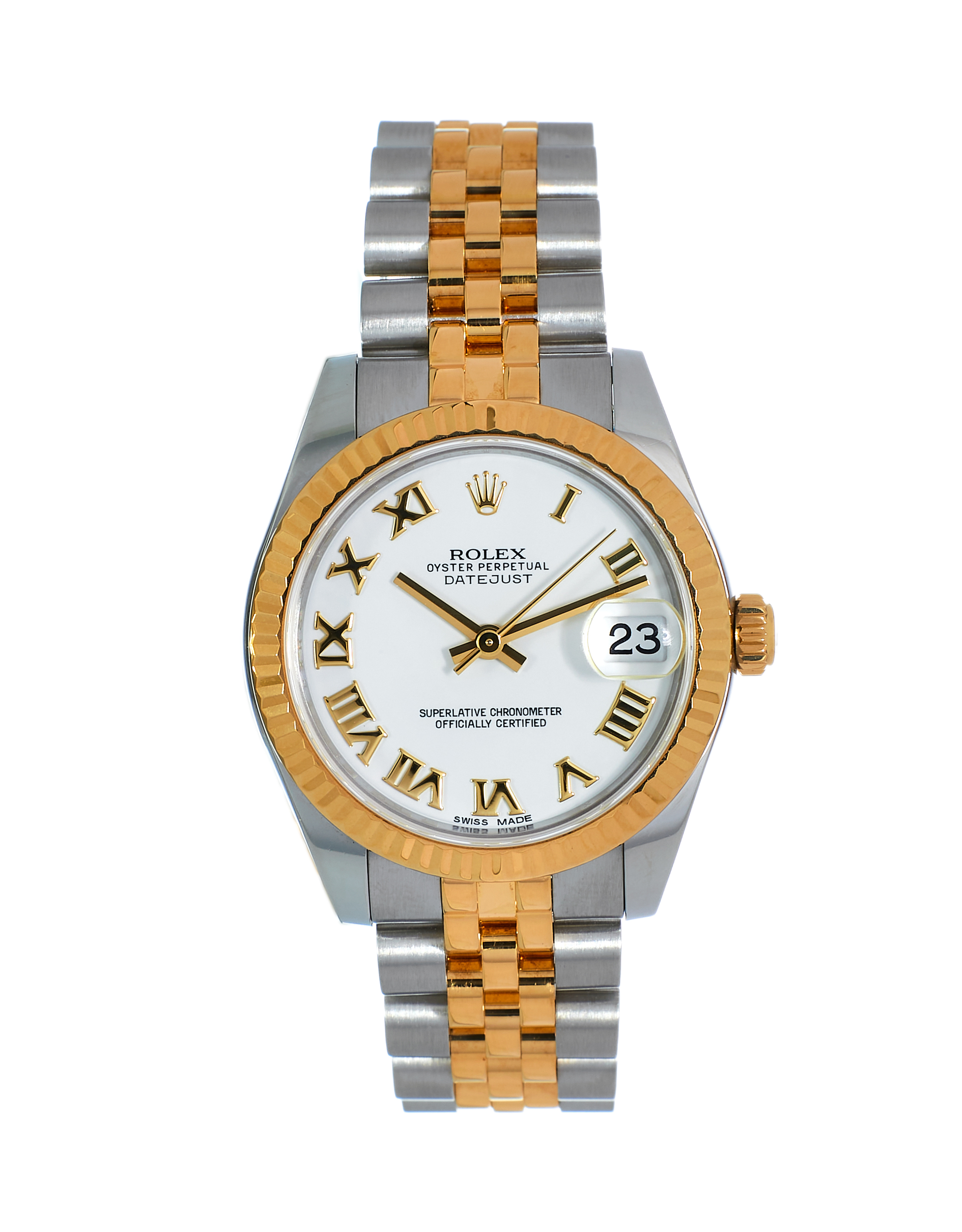 This Rolex Datejust Lady 31 178273 has a white roman numeral dial and a bracelet strap. This Rolex has undergone a thorough inspection of water resistance, accuracy, functionality and condition to determine the level of reconditioning required to meet our strict standards. It has also been referenced against technical documents and manufacturer records where available to ensure authenticity and a clean history. All our watches have a 24-month warranty for your peace of mind. One of our skilled polishing technicians has removed marks on the case and bracelet of this watch, brought about by daily wear and tear, which is why this watch does not come with the remaining manufacturer’s warranty.