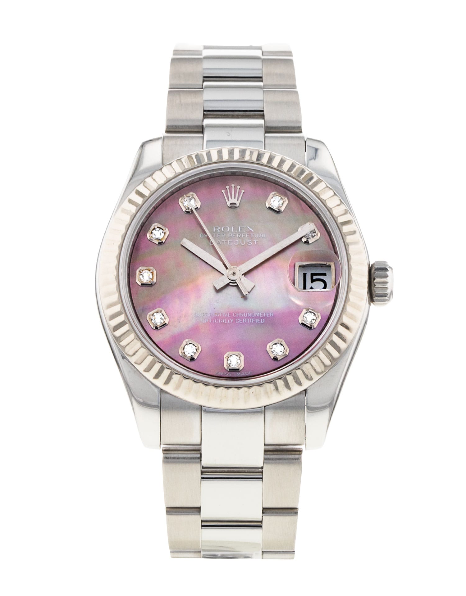 This Rolex Datejust Lady 31 178274 has a mother of pearl - black - diamond dial and a bracelet strap. This Rolex has undergone a thorough inspection of water resistance, accuracy, functionality and condition to determine the level of reconditioning required to meet our strict standards. It has also been referenced against technical documents and manufacturer records where available to ensure authenticity and a clean history. All our watches have a 24-month warranty for your peace of mind. One of our skilled polishing technicians has removed marks on the case and bracelet of this watch, brought about by daily wear and tear, which is why this watch does not come with the remaining manufacturer’s warranty.