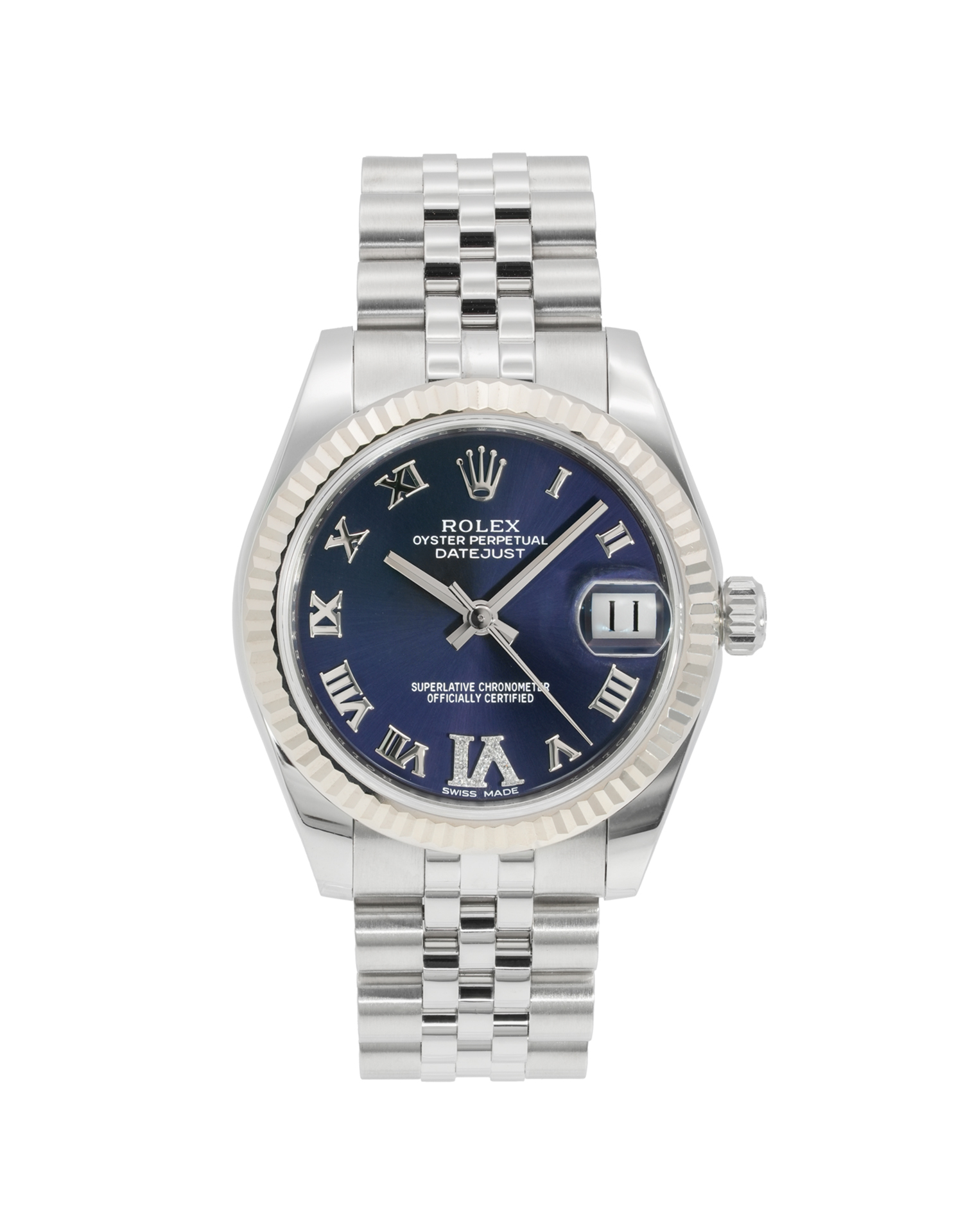 This Rolex Datejust Lady 31 178274 has a purple roman numeral diamond dial and a bracelet strap. This Rolex has undergone a thorough inspection of water resistance, accuracy, functionality and condition to determine the level of reconditioning required to meet our strict standards. It has also been referenced against technical documents and manufacturer records where available to ensure authenticity and a clean history. All our watches have a 24-month warranty for your peace of mind. One of our skilled polishing technicians has removed marks on the case and bracelet of this watch, brought about by daily wear and tear, which is why this watch does not come with the remaining manufacturer’s warranty.