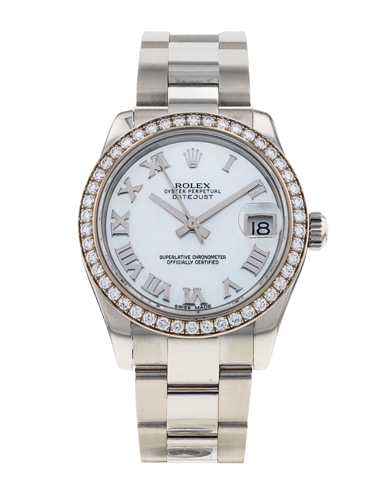 This Rolex Datejust Lady 31 178384 has a mother of pearl white roman numeral diamond dial and a bracelet strap. This Rolex has undergone a thorough inspection of water resistance, accuracy, functionality and condition to determine the level of reconditioning required to meet our strict standards. It has also been referenced against technical documents and manufacturer records where available to ensure authenticity and a clean history. All our watches have a 24-month warranty for your peace of mind. One of our skilled polishing technicians has removed marks on the case and bracelet of this watch, brought about by daily wear and tear, which is why this watch does not come with the remaining manufacturer’s warranty.