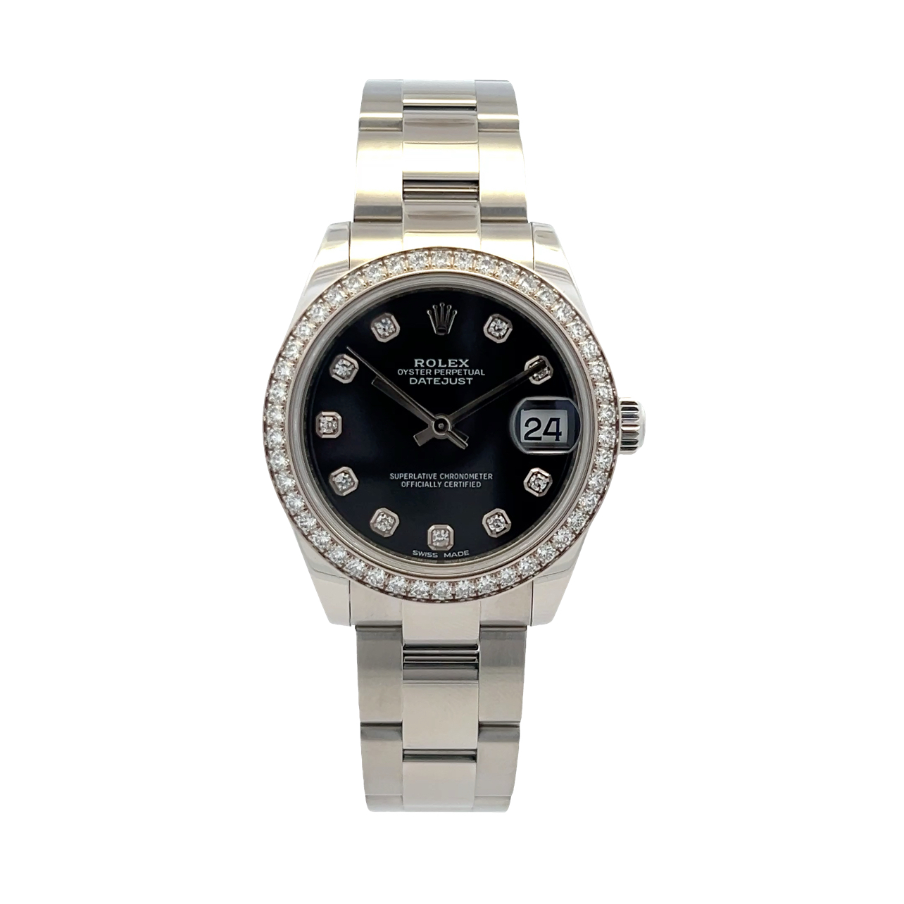 This Rolex Datejust Lady 31 178384 has a black diamond dial and a bracelet strap. This Rolex has undergone a thorough inspection of water resistance, accuracy, functionality and condition to determine the level of reconditioning required to meet our strict standards. It has also been referenced against technical documents and manufacturer records where available to ensure authenticity and a clean history. All our watches have a 24-month warranty for your peace of mind. One of our skilled polishing technicians has removed marks on the case and bracelet of this watch, brought about by daily wear and tear, which is why this watch does not come with the remaining manufacturer’s warranty.