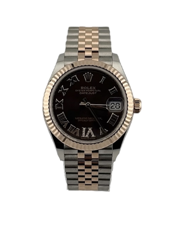 This Rolex Datejust Lady 31 278271 has a chocolate roman numeral diamond dial and a bracelet strap. This Rolex has undergone a thorough inspection of water resistance, accuracy, functionality and condition to determine the level of reconditioning required to meet our strict standards. It has also been referenced against technical documents and manufacturer records where available to ensure authenticity and a clean history. Our watches have a 24-month warranty for your peace of mind, in conjunction with any remaining manufacturer’s warranty from new or from service. To maintain the manufacturer’s warranty on this watch, it has not been polished in our service centre.