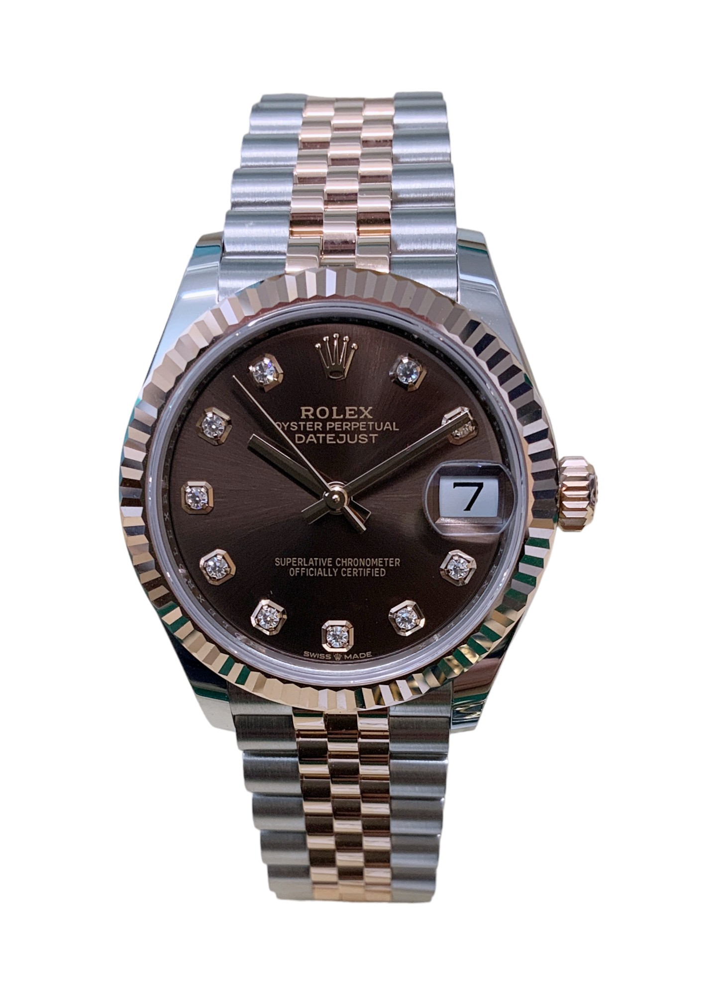 This Rolex Datejust Lady 31 278271 has a chocolate diamond dial and a bracelet strap. This Rolex has undergone a thorough inspection of water resistance, accuracy, functionality and condition to determine the level of reconditioning required to meet our strict standards. It has also been referenced against technical documents and manufacturer records where available to ensure authenticity and a clean history. Our watches have a 24-month warranty for your peace of mind, in conjunction with any remaining manufacturer’s warranty from new or from service. To maintain the manufacturer’s warranty on this watch, it has not been polished in our service centre.