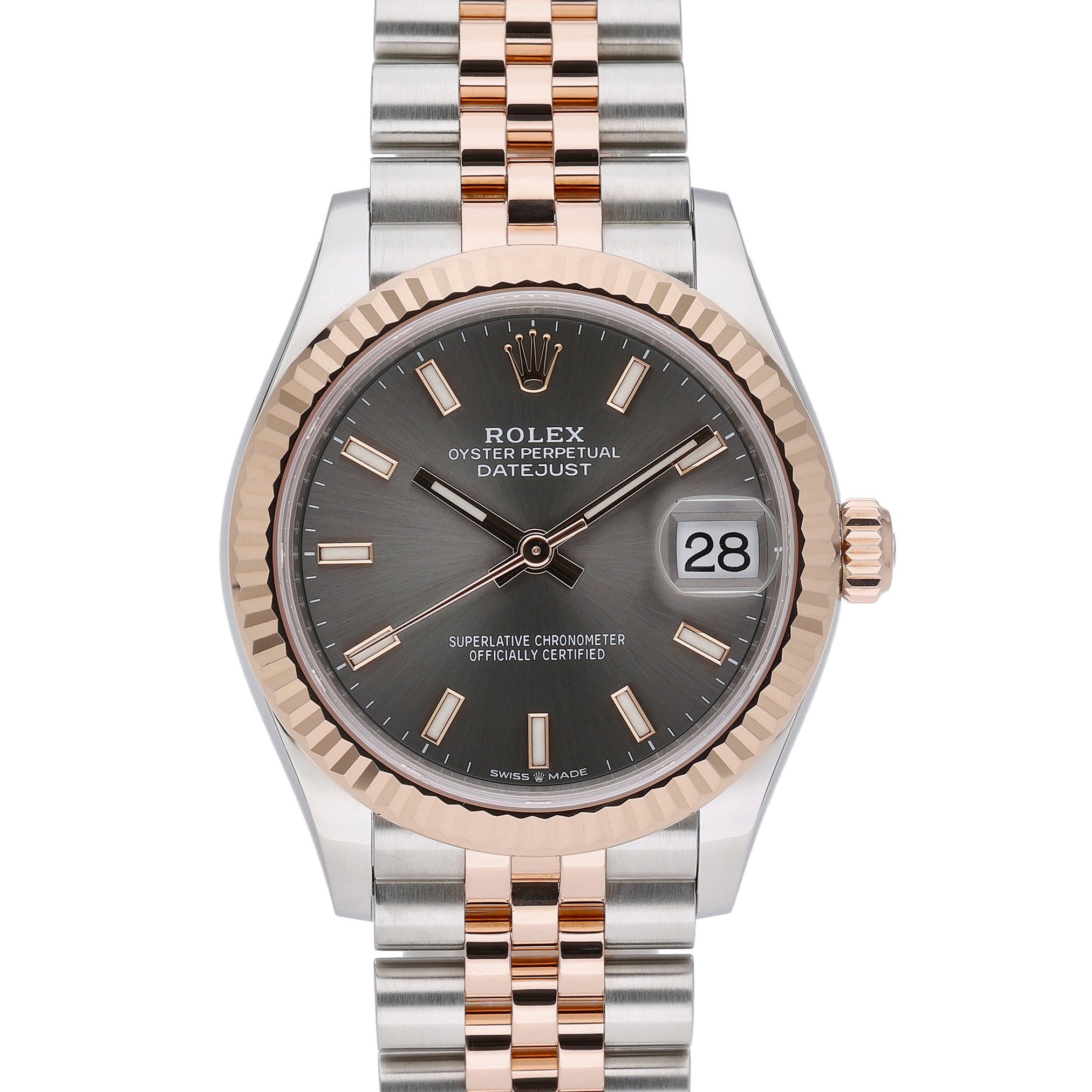 This Rolex Datejust Lady 31 278271 has a slate baton dial and a bracelet strap. This Rolex has undergone a thorough inspection of water resistance, accuracy, functionality and condition to determine the level of reconditioning required to meet our strict standards. It has also been referenced against technical documents and manufacturer records where available to ensure authenticity and a clean history. Our watches have a 24-month warranty for your peace of mind, in conjunction with any remaining manufacturer’s warranty from new or from service. To maintain the manufacturer’s warranty on this watch, it has not been polished in our service centre.