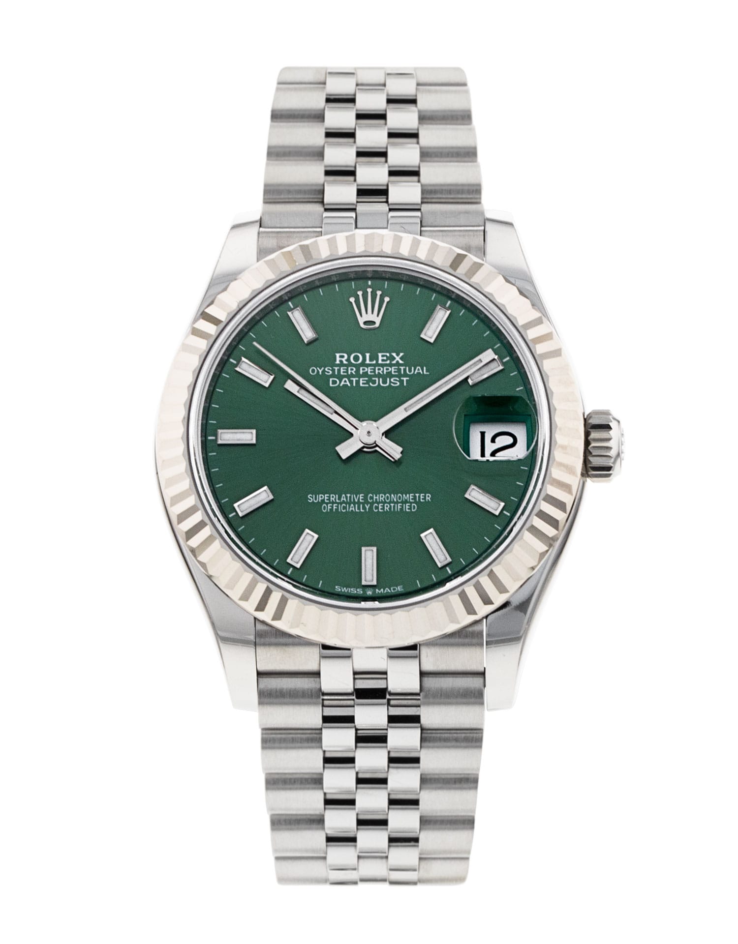 This Rolex Datejust Lady 31 278274 has a green baton dial and a bracelet strap. This Rolex has undergone a thorough inspection of water resistance, accuracy, functionality and condition to determine the level of reconditioning required to meet our strict standards. It has also been referenced against technical documents and manufacturer records where available to ensure authenticity and a clean history. Our watches have a 24-month warranty for your peace of mind, in conjunction with any remaining manufacturer’s warranty from new or from service. To maintain the manufacturer’s warranty on this watch, it has not been polished in our service centre.