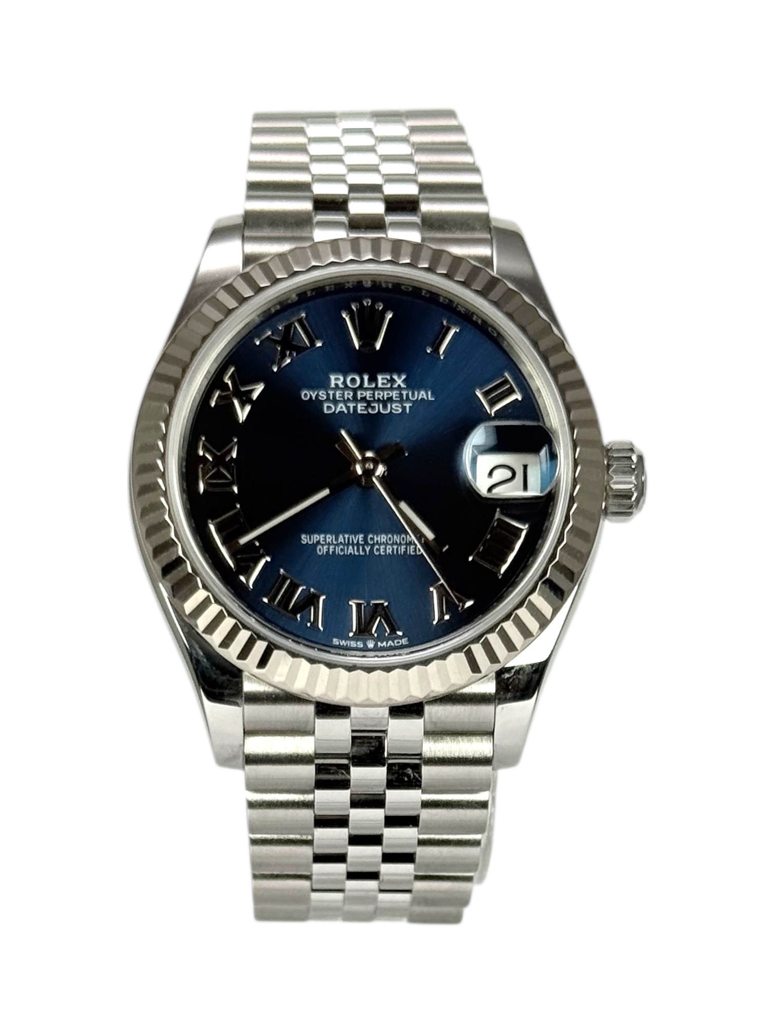 This Rolex Datejust Lady 31 278274 has a blue roman numeral dial and a bracelet strap. This Rolex has undergone a thorough inspection of water resistance, accuracy, functionality and condition to determine the level of reconditioning required to meet our strict standards. It has also been referenced against technical documents and manufacturer records where available to ensure authenticity and a clean history. Our watches have a 24-month warranty for your peace of mind, in conjunction with any remaining manufacturer’s warranty from new or from service. To maintain the manufacturer’s warranty on this watch, it has not been polished in our service centre.