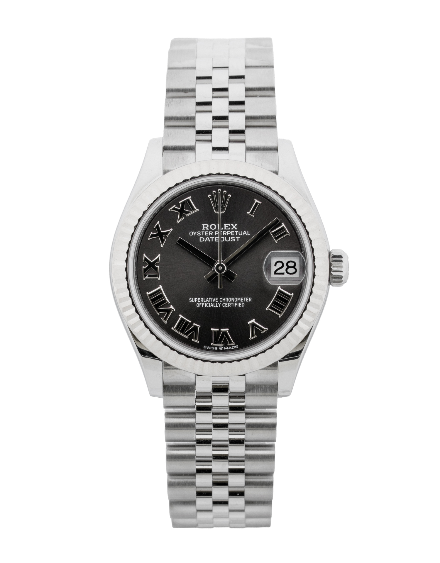 This Rolex Datejust Lady 31 278274 has a grey roman numeral dial and a bracelet strap. This Rolex has undergone a thorough inspection of water resistance, accuracy, functionality and condition to determine the level of reconditioning required to meet our strict standards. It has also been referenced against technical documents and manufacturer records where available to ensure authenticity and a clean history. All our watches have a 24-month warranty for your peace of mind. One of our skilled polishing technicians has removed marks on the case and bracelet of this watch, brought about by daily wear and tear, which is why this watch does not come with the remaining manufacturer’s warranty.