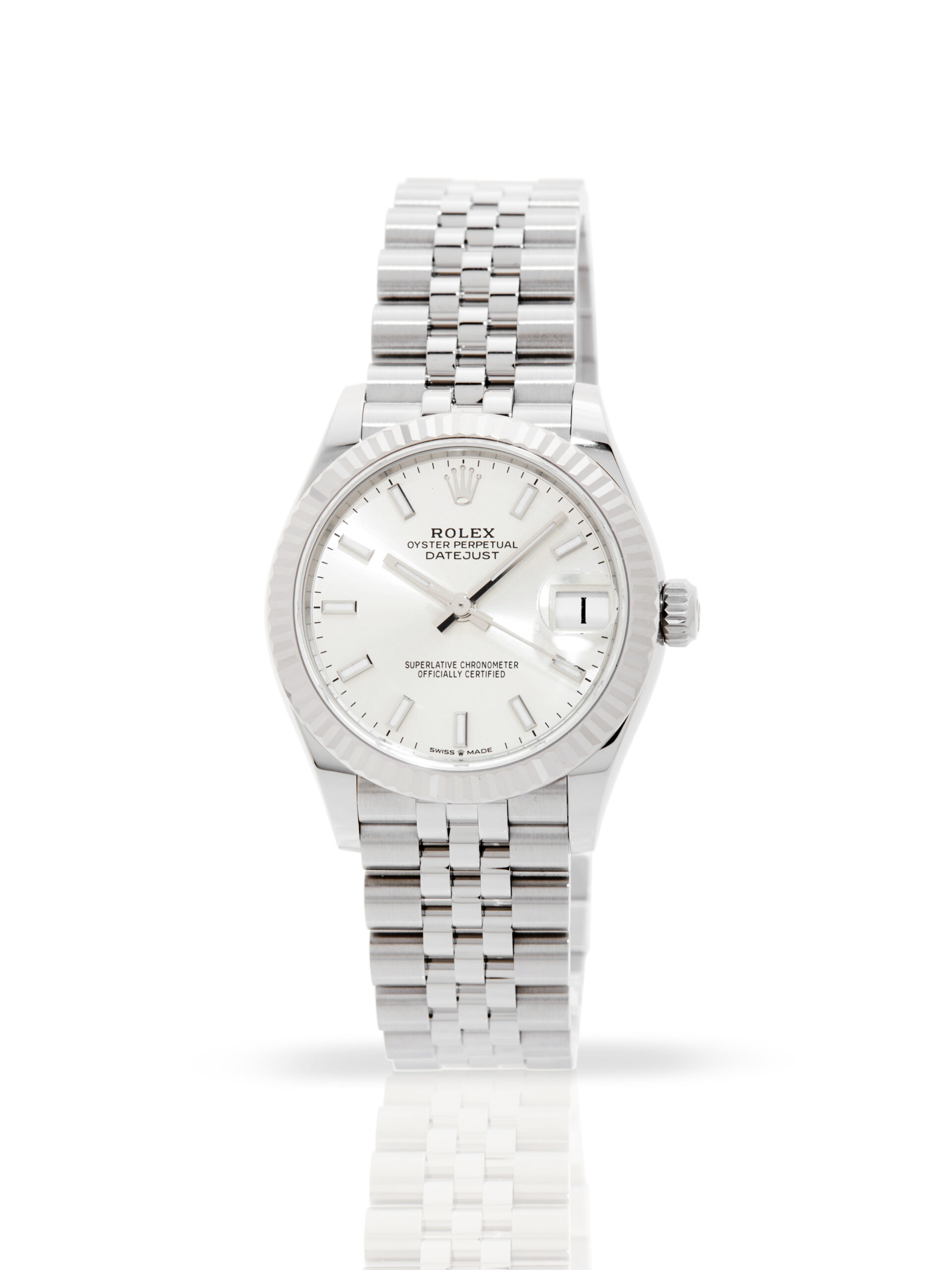 This Rolex Datejust Lady 31 278274 has a silver baton dial and a bracelet strap. This Rolex has undergone a thorough inspection of water resistance, accuracy, functionality and condition to determine the level of reconditioning required to meet our strict standards. It has also been referenced against technical documents and manufacturer records where available to ensure authenticity and a clean history. Our watches have a 24-month warranty for your peace of mind, in conjunction with any remaining manufacturer’s warranty from new or from service. To maintain the manufacturer’s warranty on this watch, it has not been polished in our service centre.