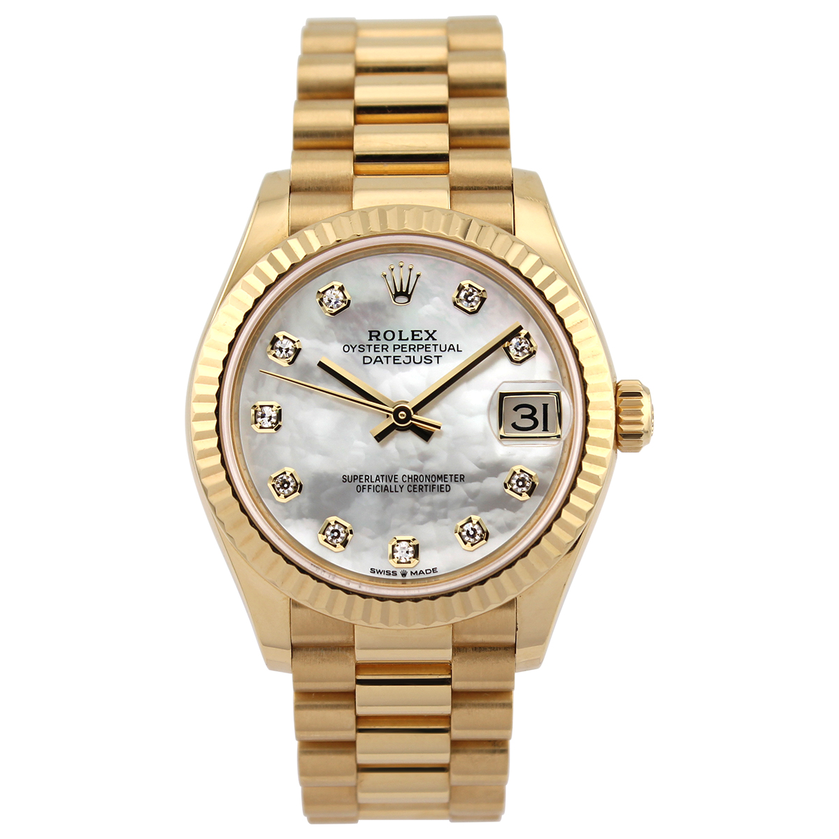This Rolex Datejust Lady 31 278278 has a mother of pearl white - diamond dial and a bracelet strap. This Rolex has undergone a thorough inspection of water resistance, accuracy, functionality and condition to determine the level of reconditioning required to meet our strict standards. It has also been referenced against technical documents and manufacturer records where available to ensure authenticity and a clean history. All our watches have a 24-month warranty for your peace of mind. One of our skilled polishing technicians has removed marks on the case and bracelet of this watch, brought about by daily wear and tear, which is why this watch does not come with the remaining manufacturer’s warranty.