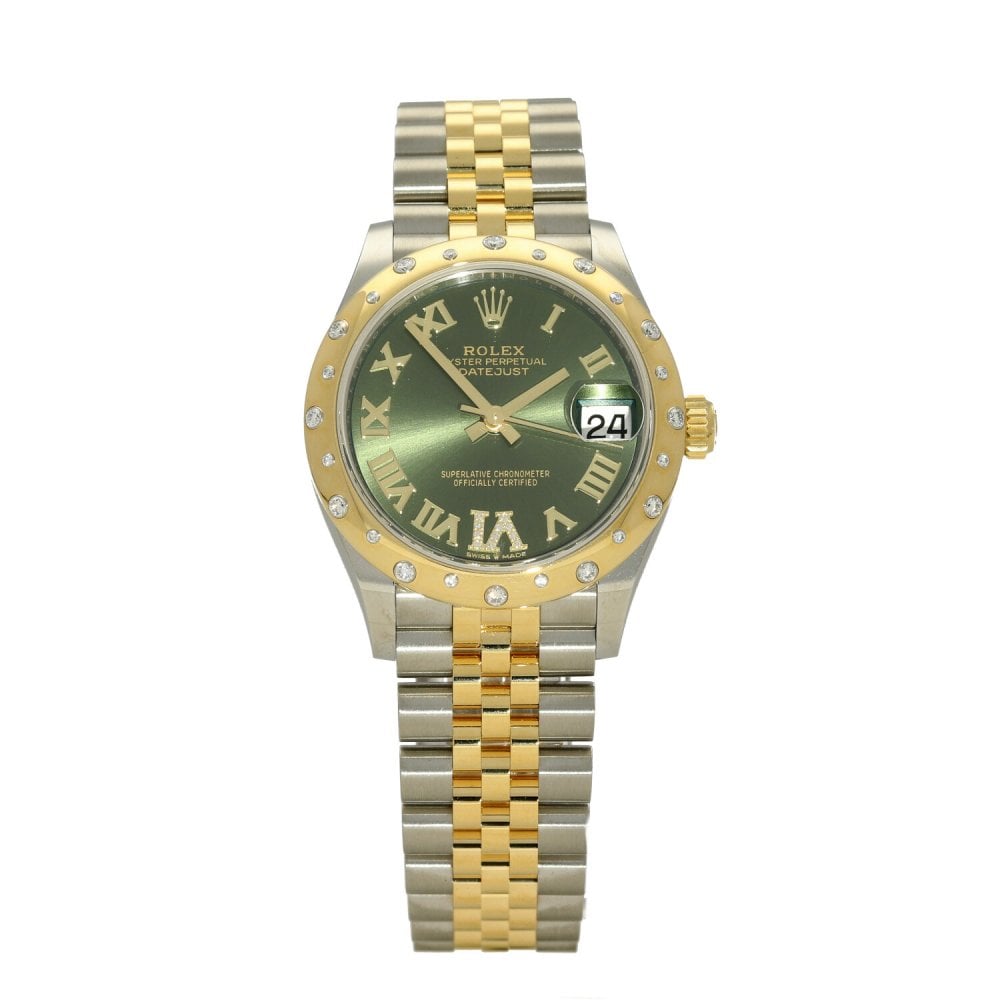This Rolex Datejust Lady 31 278343 RBR has a green roman numeral diamond dial and a bracelet strap. This Rolex has undergone a thorough inspection of water resistance, accuracy, functionality and condition to determine the level of reconditioning required to meet our strict standards. It has also been referenced against technical documents and manufacturer records where available to ensure authenticity and a clean history. All our watches have a 24-month warranty for your peace of mind. One of our skilled polishing technicians has removed marks on the case and bracelet of this watch, brought about by daily wear and tear, which is why this watch does not come with the remaining manufacturer’s warranty.