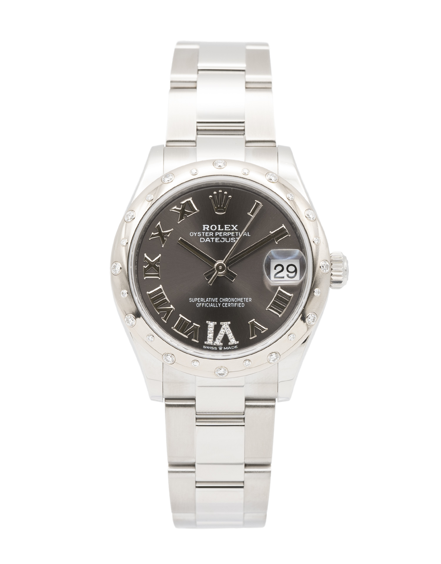 This Rolex Datejust Lady 31 278344 RBR has a dark grey roman numeral diamond dial and a bracelet strap. This Rolex has undergone a thorough inspection of water resistance, accuracy, functionality and condition to determine the level of reconditioning required to meet our strict standards. It has also been referenced against technical documents and manufacturer records where available to ensure authenticity and a clean history. Our watches have a 24-month warranty for your peace of mind, in conjunction with any remaining manufacturer’s warranty from new or from service. To maintain the manufacturer’s warranty on this watch, it has not been polished in our service centre.