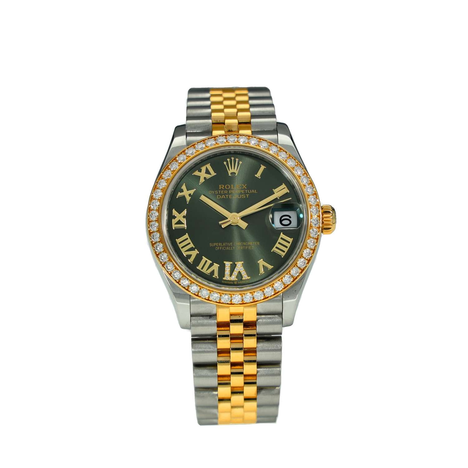 This Rolex Datejust Lady 31 278383 RBR has a olive green roman numeral diamond dial and a bracelet strap. This Rolex has undergone a thorough inspection of water resistance, accuracy, functionality and condition to determine the level of reconditioning required to meet our strict standards. It has also been referenced against technical documents and manufacturer records where available to ensure authenticity and a clean history. Our watches have a 24-month warranty for your peace of mind, in conjunction with any remaining manufacturer’s warranty from new or from service. To maintain the manufacturer’s warranty on this watch, it has not been polished in our service centre.