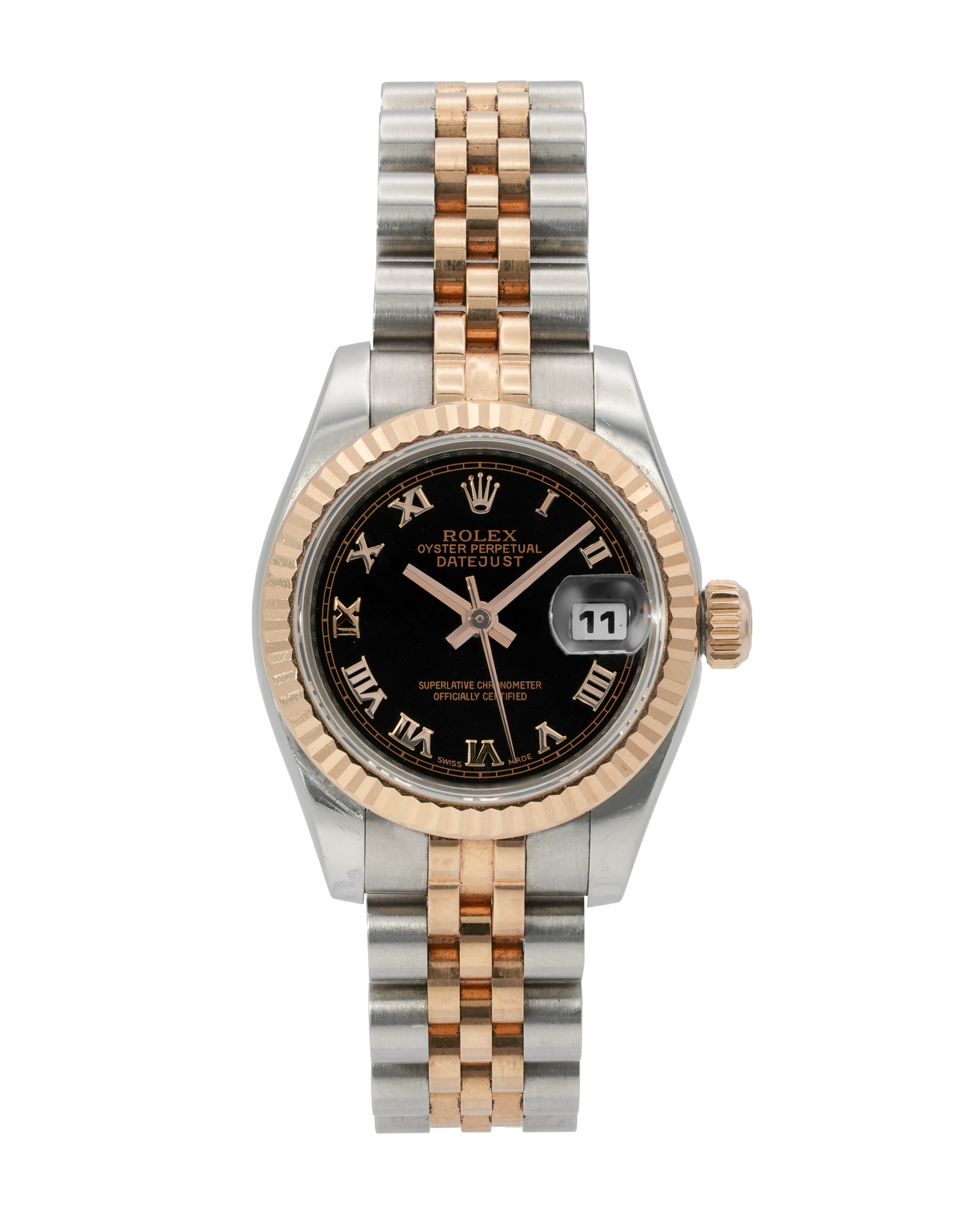 This Rolex Datejust Lady 179171 has a black roman numeral dial and a bracelet strap. This Rolex has undergone a thorough inspection of water resistance, accuracy, functionality and condition to determine the level of reconditioning required to meet our strict standards. It has also been referenced against technical documents and manufacturer records where available to ensure authenticity and a clean history. All our watches have a 24-month warranty for your peace of mind. One of our skilled polishing technicians has removed marks on the case and bracelet of this watch, brought about by daily wear and tear, which is why this watch does not come with the remaining manufacturer’s warranty.