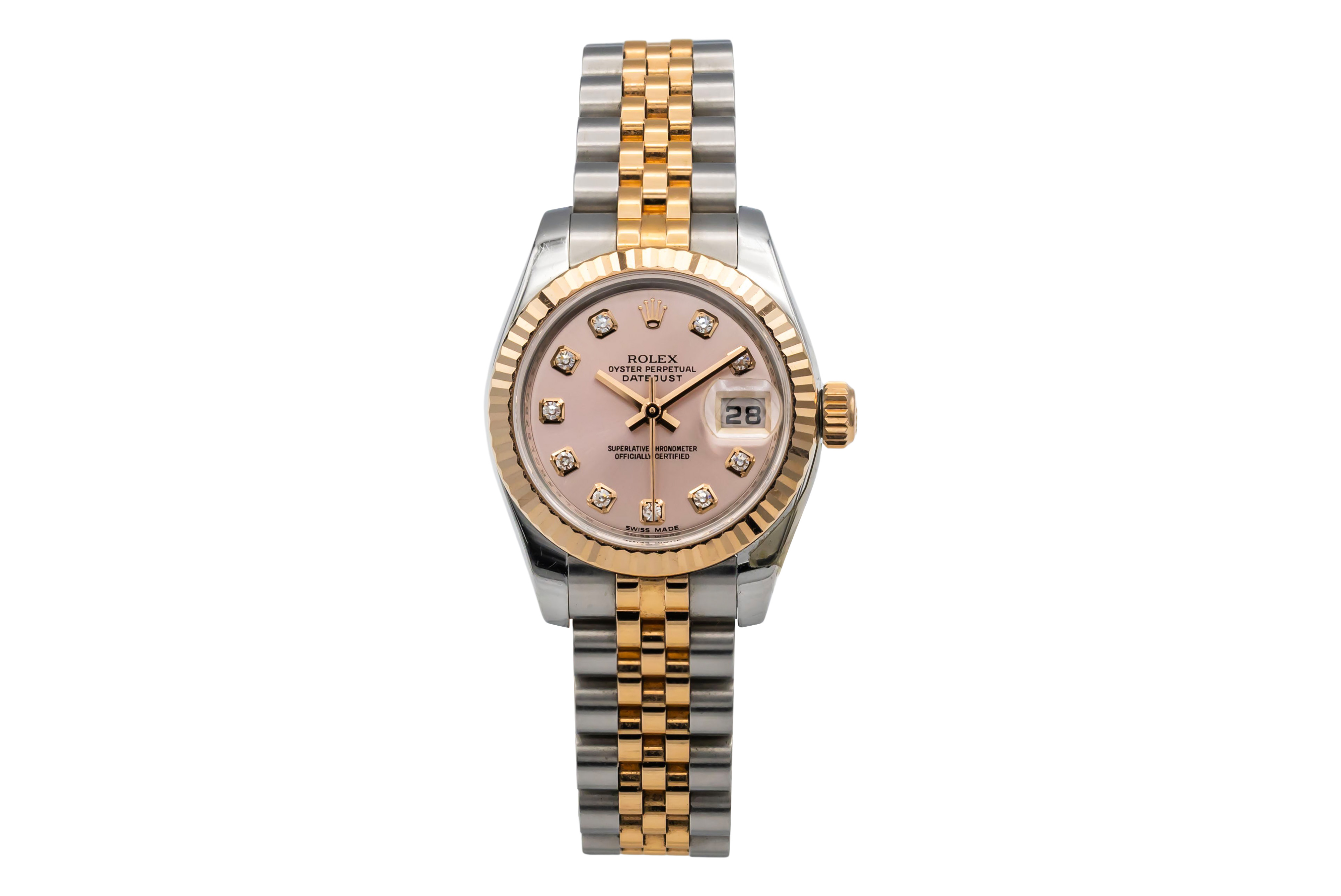 This Rolex Datejust Lady 179171 has a pink goldust diamond dial and a bracelet strap. This Rolex has undergone a thorough inspection of water resistance, accuracy, functionality and condition to determine the level of reconditioning required to meet our strict standards. It has also been referenced against technical documents and manufacturer records where available to ensure authenticity and a clean history. All our watches have a 24-month warranty for your peace of mind. One of our skilled polishing technicians has removed marks on the case and bracelet of this watch, brought about by daily wear and tear, which is why this watch does not come with the remaining manufacturer’s warranty.