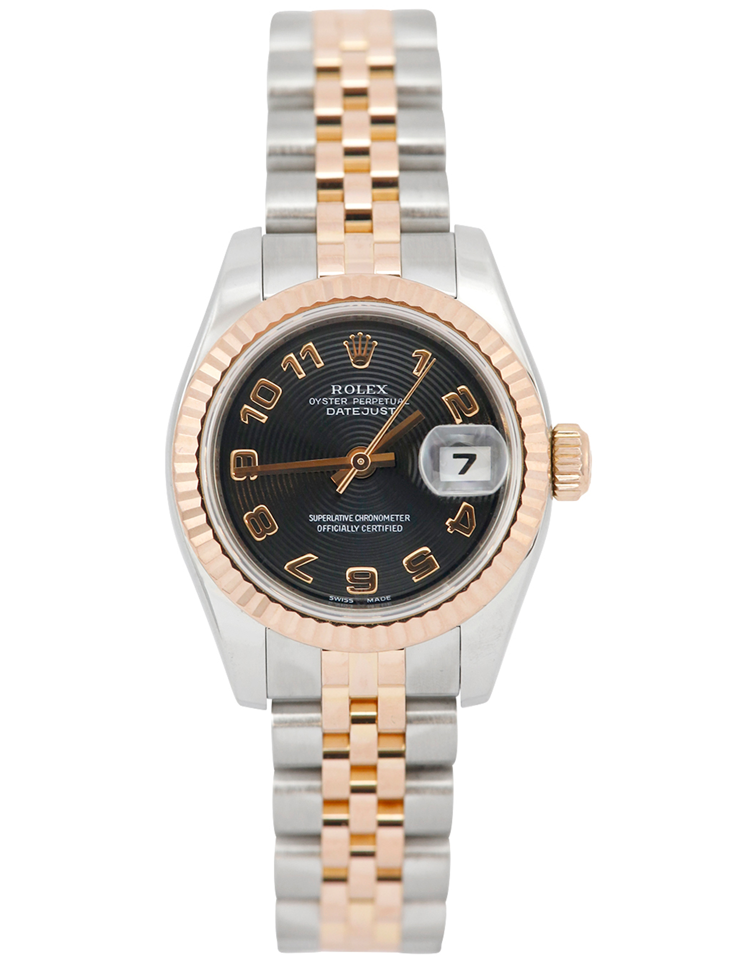 This Rolex Datejust Lady 179171 has a black arabic dial and a bracelet strap. This Rolex has undergone a thorough inspection of water resistance, accuracy, functionality and condition to determine the level of reconditioning required to meet our strict standards. It has also been referenced against technical documents and manufacturer records where available to ensure authenticity and a clean history. All our watches have a 24-month warranty for your peace of mind. One of our skilled polishing technicians has removed marks on the case and bracelet of this watch, brought about by daily wear and tear, which is why this watch does not come with the remaining manufacturer’s warranty.