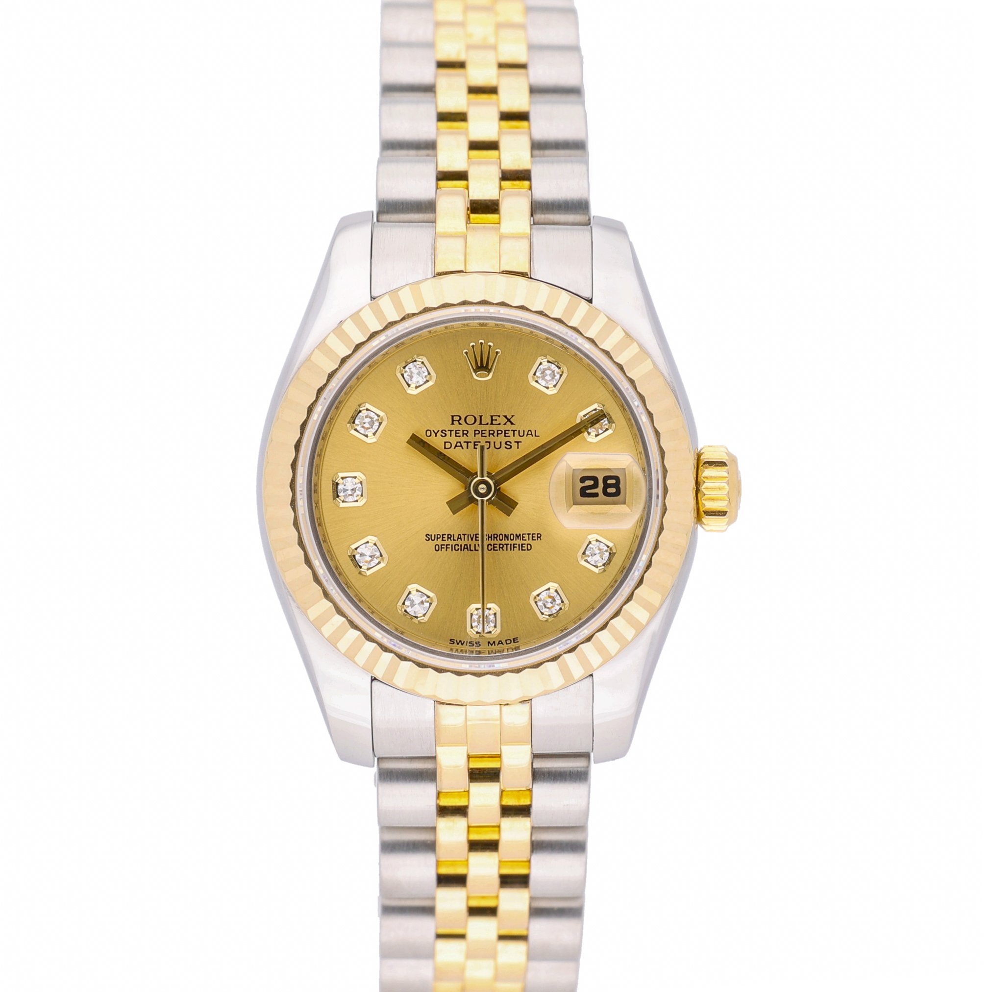 This Rolex Datejust Lady 179173 has a champagne diamond dial and a bracelet strap. This Rolex has undergone a thorough inspection of water resistance, accuracy, functionality and condition to determine the level of reconditioning required to meet our strict standards. It has also been referenced against technical documents and manufacturer records where available to ensure authenticity and a clean history. All our watches have a 24-month warranty for your peace of mind. One of our skilled polishing technicians has removed marks on the case and bracelet of this watch, brought about by daily wear and tear, which is why this watch does not come with the remaining manufacturer’s warranty.