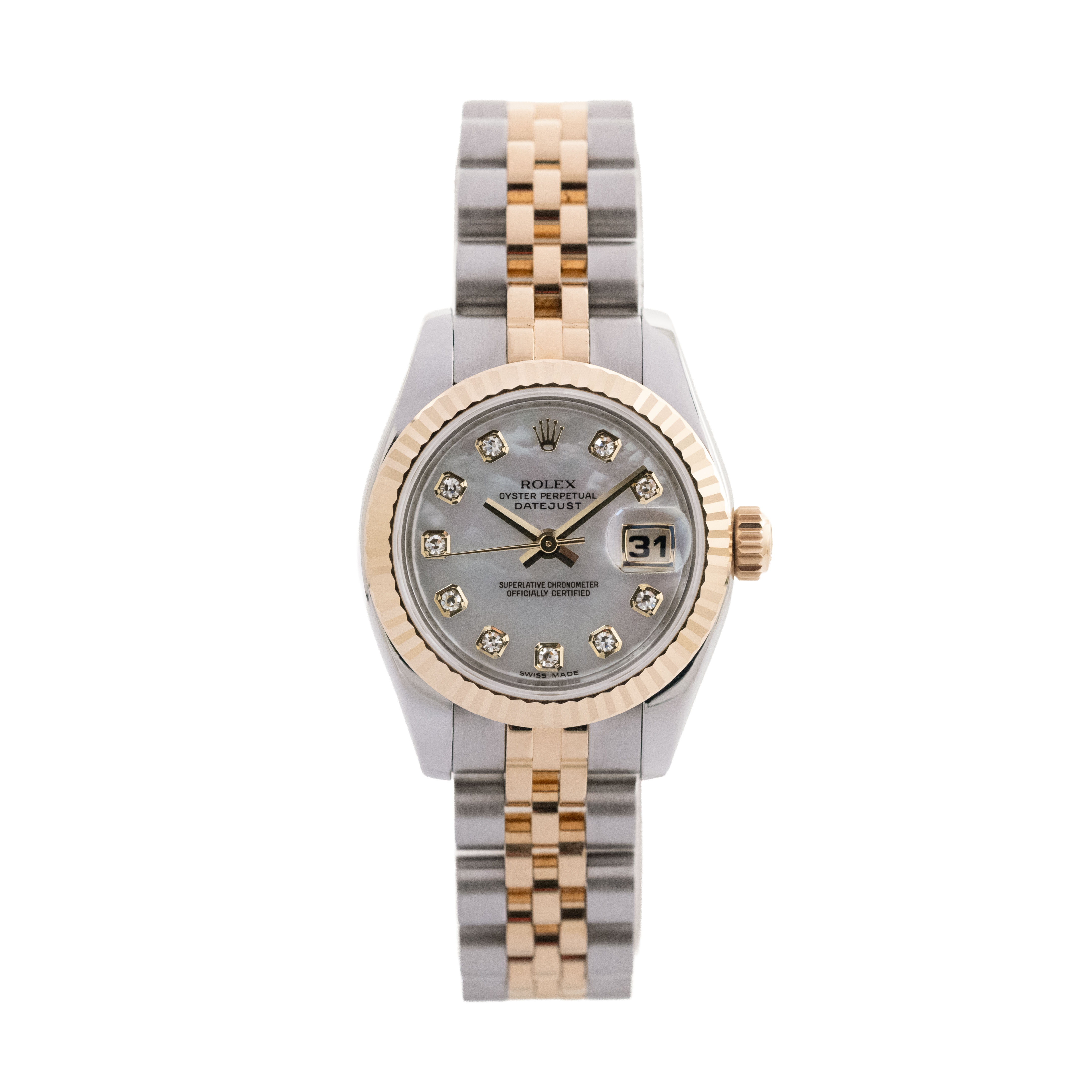 This Rolex Datejust Lady 179173 has a mother of pearl white - diamond dial and a bracelet strap. This Rolex has undergone a thorough inspection of water resistance, accuracy, functionality and condition to determine the level of reconditioning required to meet our strict standards. It has also been referenced against technical documents and manufacturer records where available to ensure authenticity and a clean history. All our watches have a 24-month warranty for your peace of mind. One of our skilled polishing technicians has removed marks on the case and bracelet of this watch, brought about by daily wear and tear, which is why this watch does not come with the remaining manufacturer’s warranty.
