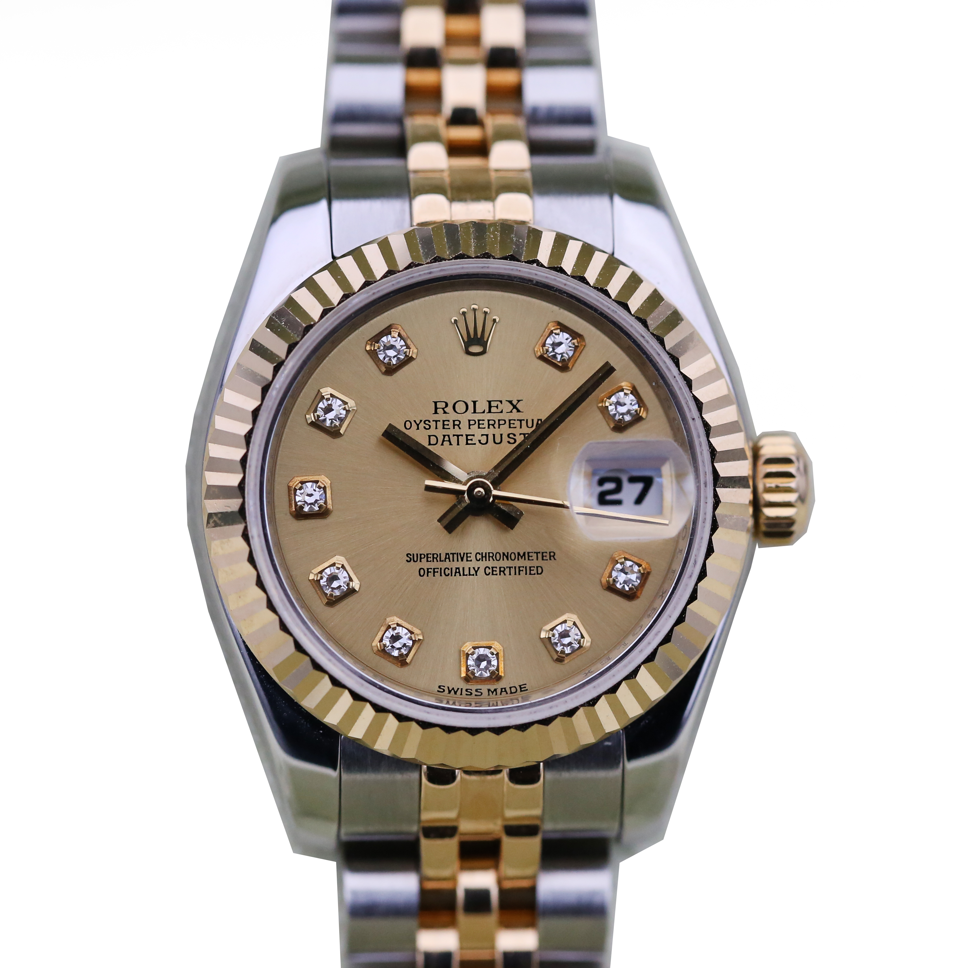 This Rolex Datejust Lady 179173 has a champagne jubilee diamond dial and a bracelet strap. This Rolex has undergone a thorough inspection of water resistance, accuracy, functionality and condition to determine the level of reconditioning required to meet our strict standards. It has also been referenced against technical documents and manufacturer records where available to ensure authenticity and a clean history. All our watches have a 24-month warranty for your peace of mind. One of our skilled polishing technicians has removed marks on the case and bracelet of this watch, brought about by daily wear and tear, which is why this watch does not come with the remaining manufacturer’s warranty.