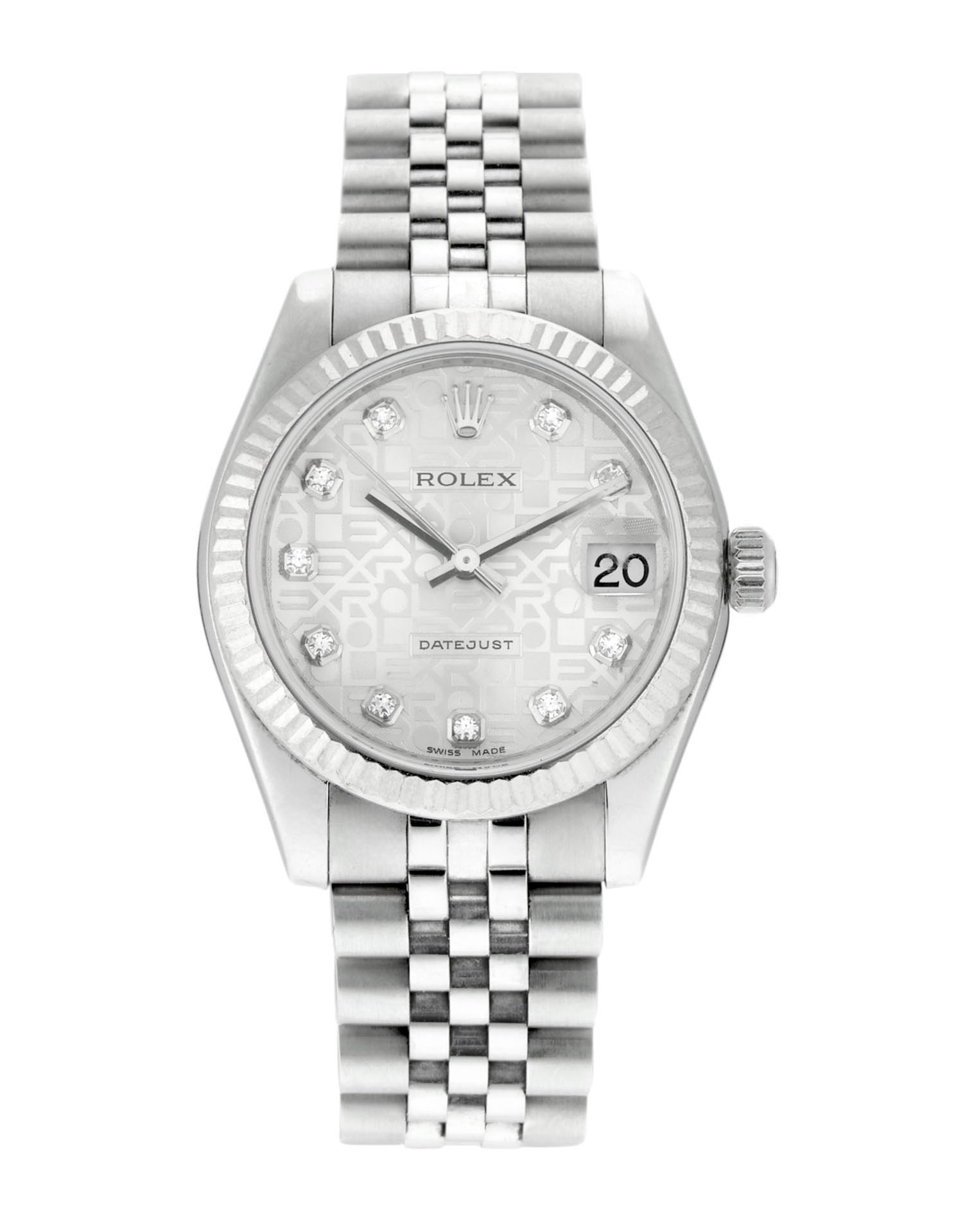This Rolex Datejust Lady 179174 has a silver jubilee diamond dial and a bracelet strap. This Rolex has undergone a thorough inspection of water resistance, accuracy, functionality and condition to determine the level of reconditioning required to meet our strict standards. It has also been referenced against technical documents and manufacturer records where available to ensure authenticity and a clean history. All our watches have a 24-month warranty for your peace of mind. One of our skilled polishing technicians has removed marks on the case and bracelet of this watch, brought about by daily wear and tear, which is why this watch does not come with the remaining manufacturer’s warranty.