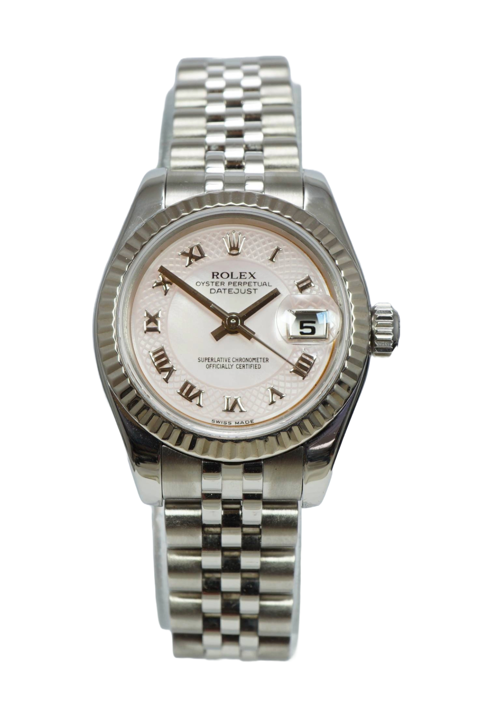 This Rolex Datejust Lady 179174 has a mother of pearl pink roman numeral dial and a bracelet strap. This Rolex has undergone a thorough inspection of water resistance, accuracy, functionality and condition to determine the level of reconditioning required to meet our strict standards. It has also been referenced against technical documents and manufacturer records where available to ensure authenticity and a clean history. All our watches have a 24-month warranty for your peace of mind. One of our skilled polishing technicians has removed marks on the case and bracelet of this watch, brought about by daily wear and tear, which is why this watch does not come with the remaining manufacturer’s warranty.
