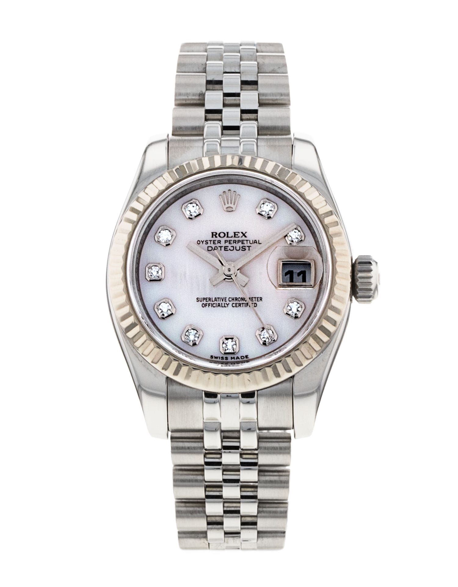 This Rolex Datejust Lady 179174 has a mother of pearl white - diamond dial and a bracelet strap. This Rolex has undergone a thorough inspection of water resistance, accuracy, functionality and condition to determine the level of reconditioning required to meet our strict standards. It has also been referenced against technical documents and manufacturer records where available to ensure authenticity and a clean history. All our watches have a 24-month warranty for your peace of mind. One of our skilled polishing technicians has removed marks on the case and bracelet of this watch, brought about by daily wear and tear, which is why this watch does not come with the remaining manufacturer’s warranty.