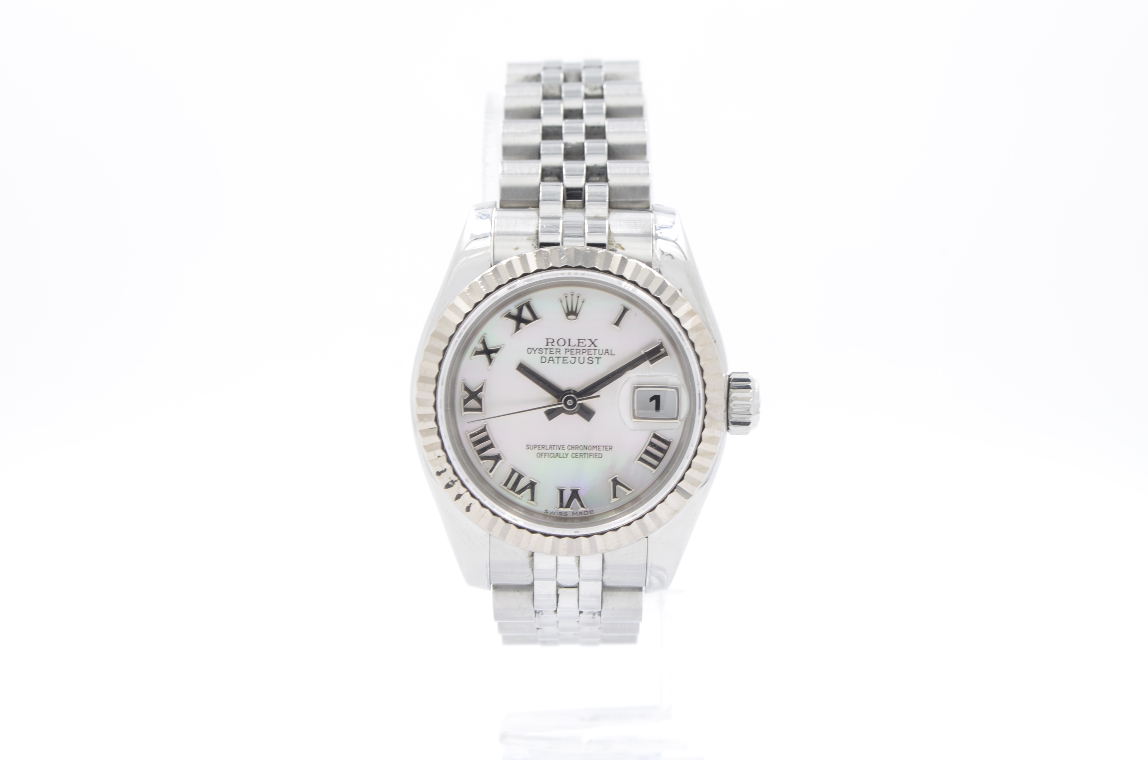 This Rolex Datejust Lady 179174 has a mother of pearl silver roman numeral dial and a bracelet strap. This Rolex has undergone a thorough inspection of water resistance, accuracy, functionality and condition to determine the level of reconditioning required to meet our strict standards. It has also been referenced against technical documents and manufacturer records where available to ensure authenticity and a clean history. All our watches have a 24-month warranty for your peace of mind. One of our skilled polishing technicians has removed marks on the case and bracelet of this watch, brought about by daily wear and tear, which is why this watch does not come with the remaining manufacturer’s warranty.