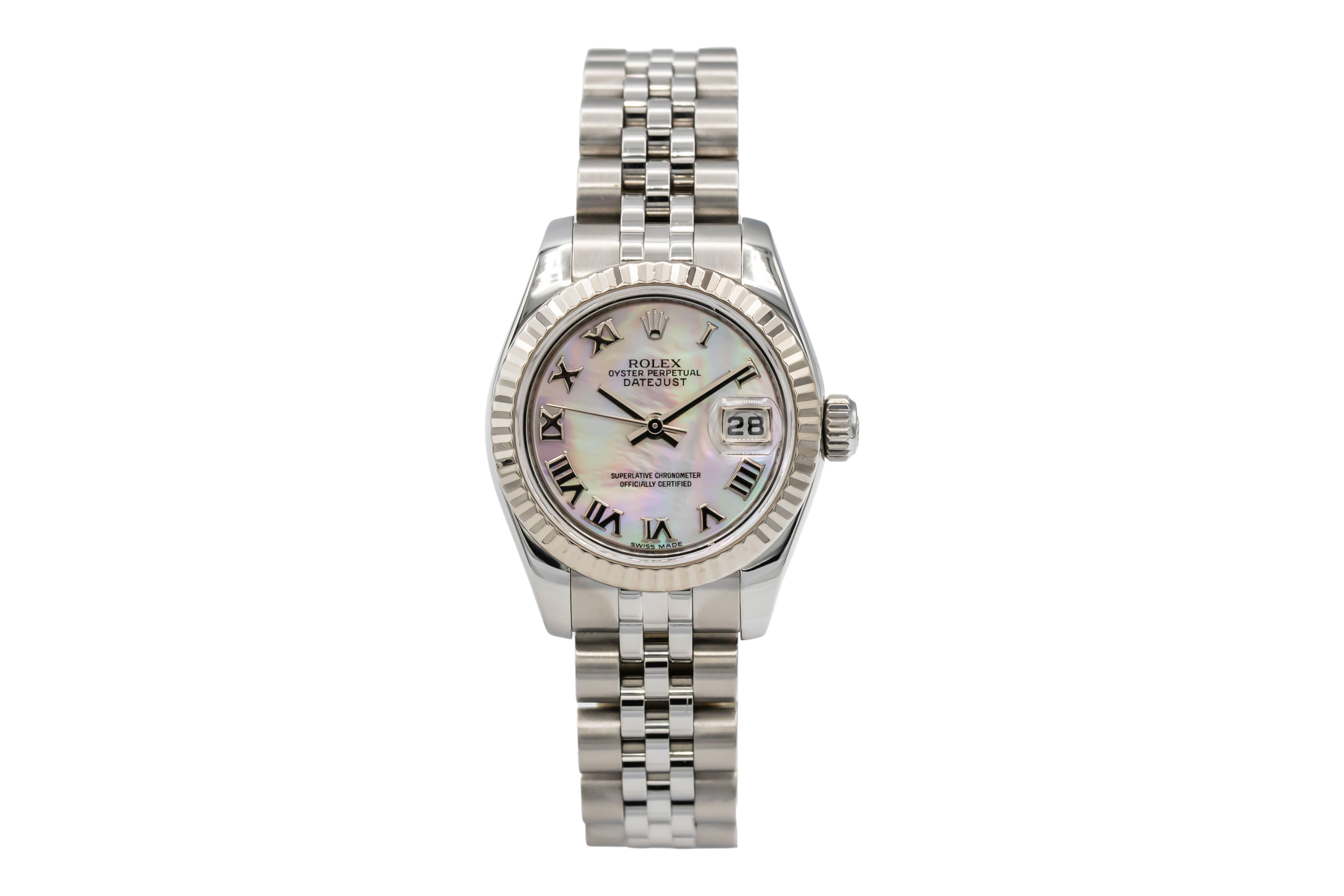 This Rolex Datejust Lady 179174 has a mother of pearl silver roman numeral dial and a bracelet strap. This Rolex has undergone a thorough inspection of water resistance, accuracy, functionality and condition to determine the level of reconditioning required to meet our strict standards. It has also been referenced against technical documents and manufacturer records where available to ensure authenticity and a clean history. All our watches have a 24-month warranty for your peace of mind. One of our skilled polishing technicians has removed marks on the case and bracelet of this watch, brought about by daily wear and tear, which is why this watch does not come with the remaining manufacturer’s warranty.