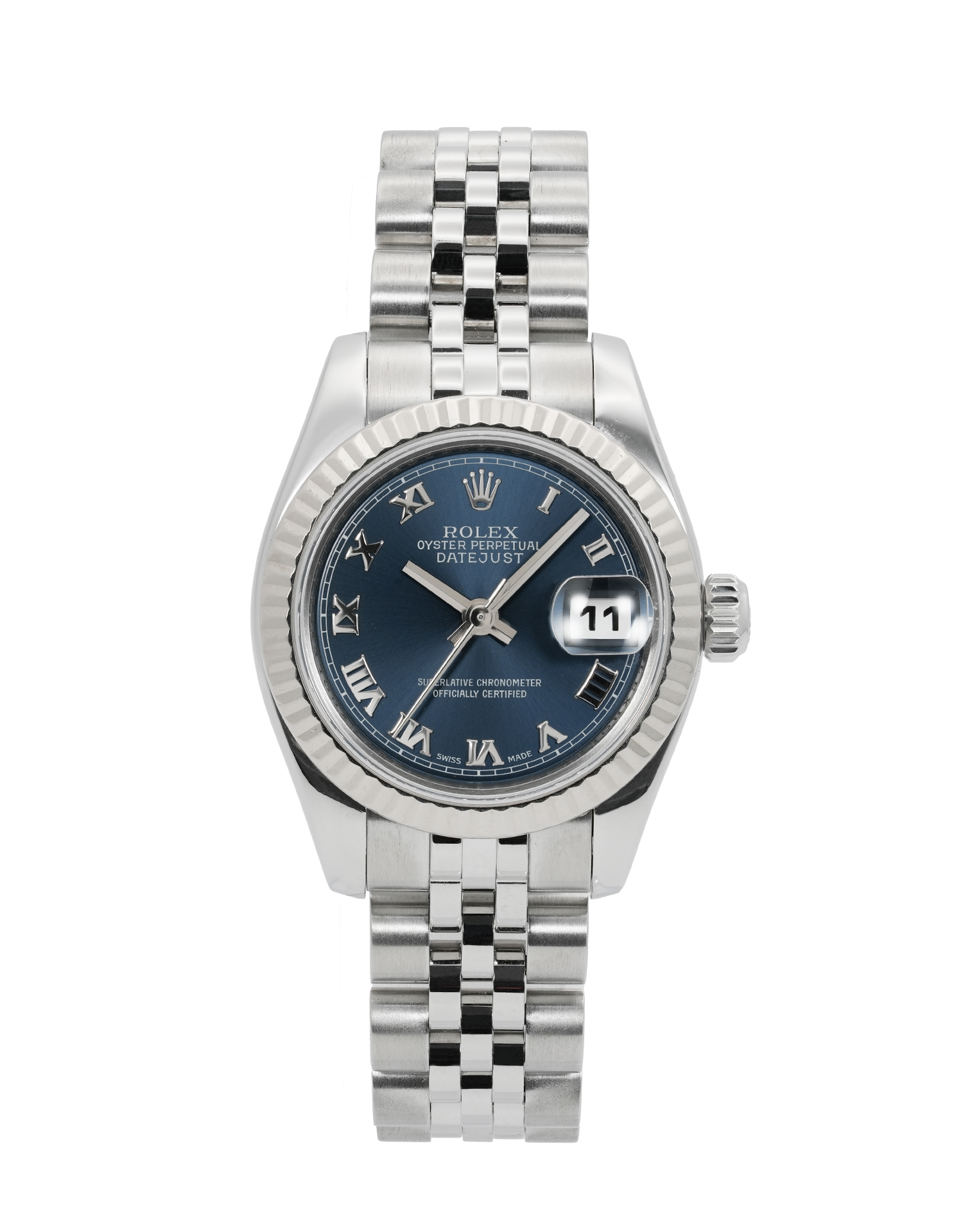 This Rolex Datejust Lady 179174 has a blue roman numeral dial and a bracelet strap. This Rolex has undergone a thorough inspection of water resistance, accuracy, functionality and condition to determine the level of reconditioning required to meet our strict standards. It has also been referenced against technical documents and manufacturer records where available to ensure authenticity and a clean history. All our watches have a 24-month warranty for your peace of mind. One of our skilled polishing technicians has removed marks on the case and bracelet of this watch, brought about by daily wear and tear, which is why this watch does not come with the remaining manufacturer’s warranty.