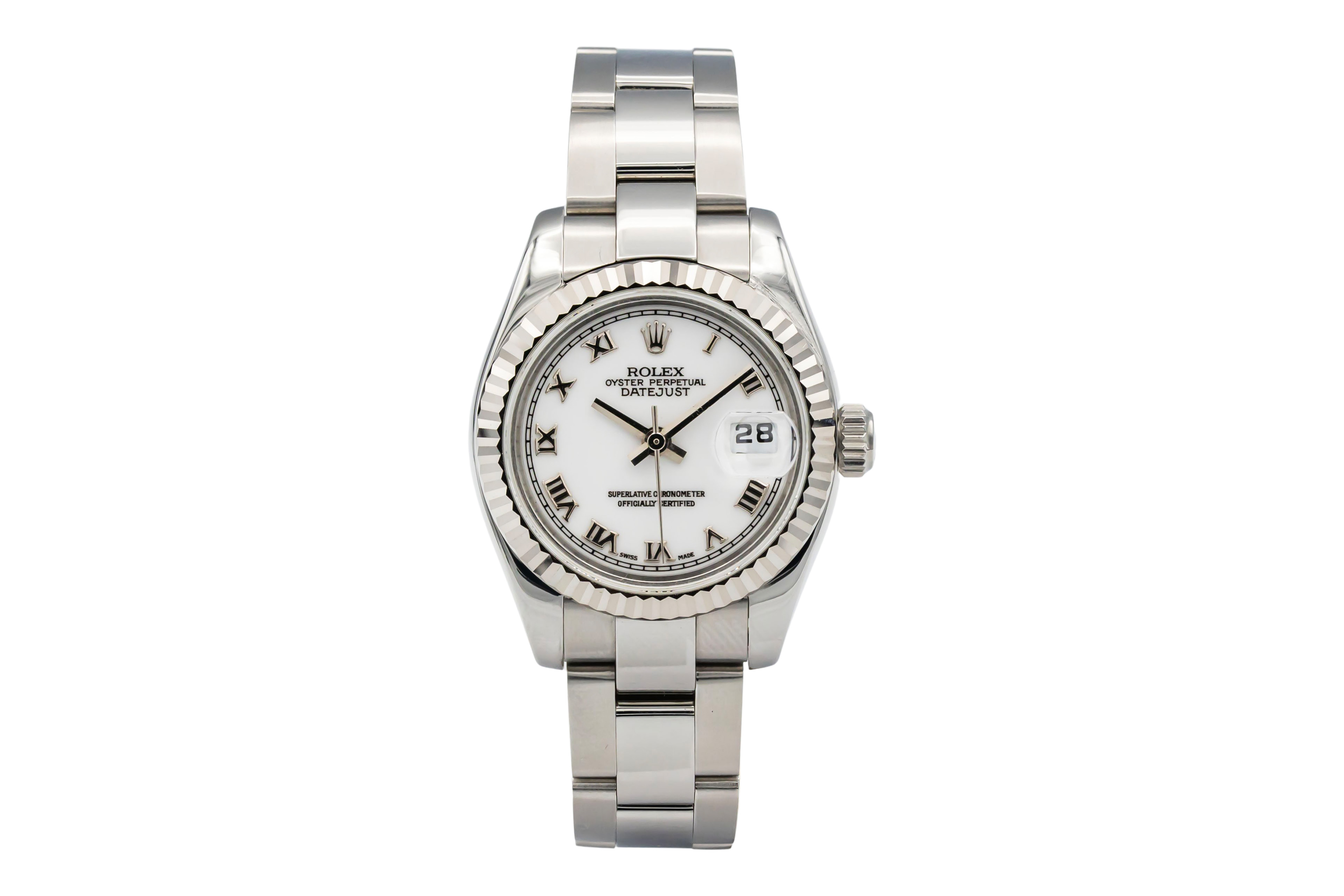 This Rolex Datejust Lady 179174 has a white roman numeral dial and a bracelet strap. This Rolex has undergone a thorough inspection of water resistance, accuracy, functionality and condition to determine the level of reconditioning required to meet our strict standards. It has also been referenced against technical documents and manufacturer records where available to ensure authenticity and a clean history. All our watches have a 24-month warranty for your peace of mind. One of our skilled polishing technicians has removed marks on the case and bracelet of this watch, brought about by daily wear and tear, which is why this watch does not come with the remaining manufacturer’s warranty.