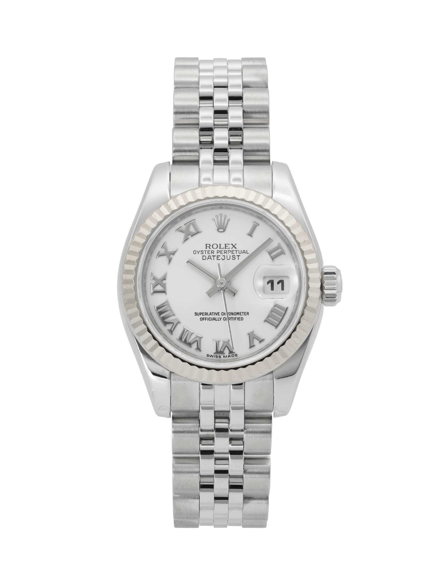 This Rolex Datejust Lady 179174 has a white roman numeral dial and a bracelet strap. This Rolex has undergone a thorough inspection of water resistance, accuracy, functionality and condition to determine the level of reconditioning required to meet our strict standards. It has also been referenced against technical documents and manufacturer records where available to ensure authenticity and a clean history. All our watches have a 24-month warranty for your peace of mind. One of our skilled polishing technicians has removed marks on the case and bracelet of this watch, brought about by daily wear and tear, which is why this watch does not come with the remaining manufacturer’s warranty.