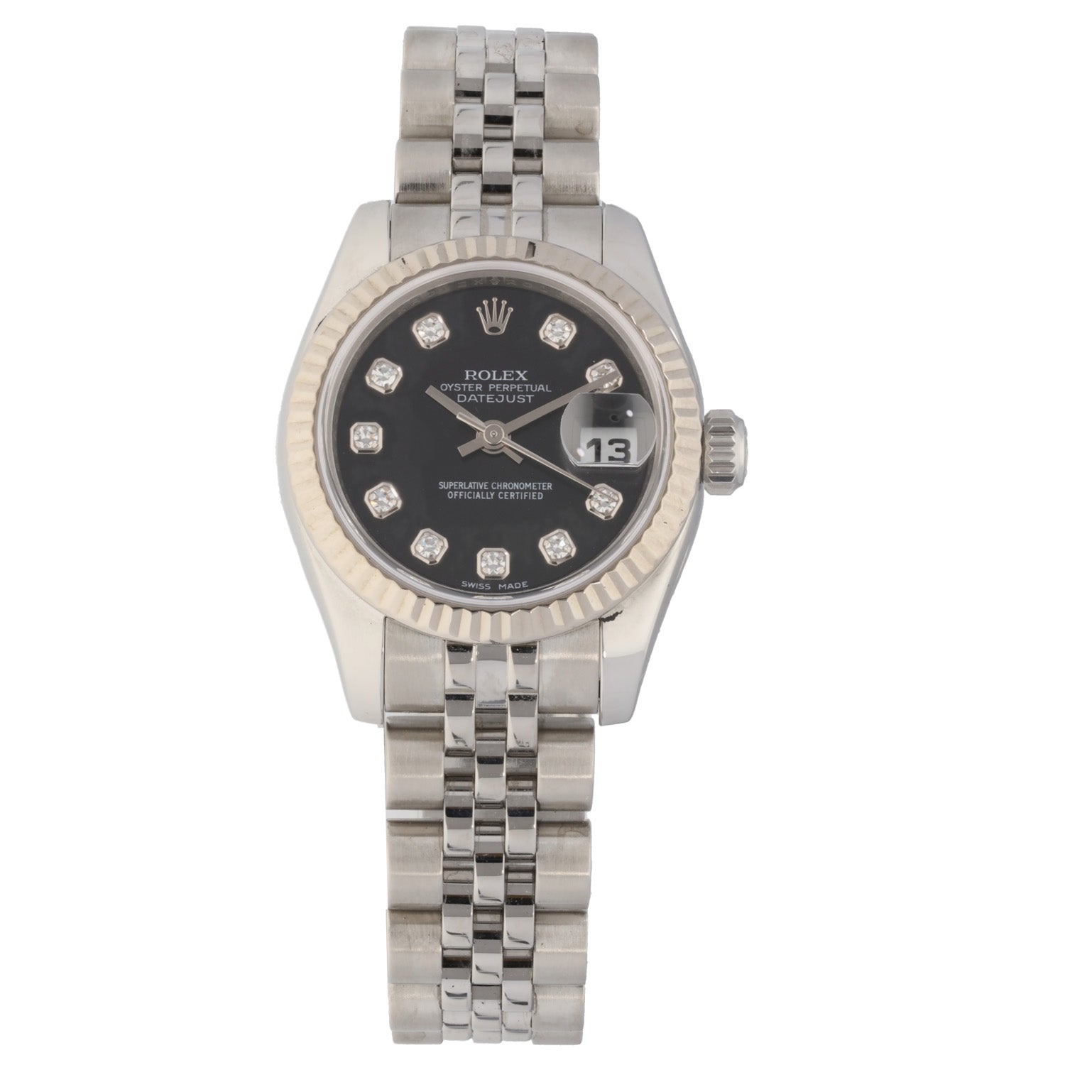 This Rolex Datejust Lady 179174 has a black diamond dial and a bracelet strap. This Rolex has undergone a thorough inspection of water resistance, accuracy, functionality and condition to determine the level of reconditioning required to meet our strict standards. It has also been referenced against technical documents and manufacturer records where available to ensure authenticity and a clean history. All our watches have a 24-month warranty for your peace of mind. One of our skilled polishing technicians has removed marks on the case and bracelet of this watch, brought about by daily wear and tear, which is why this watch does not come with the remaining manufacturer’s warranty.