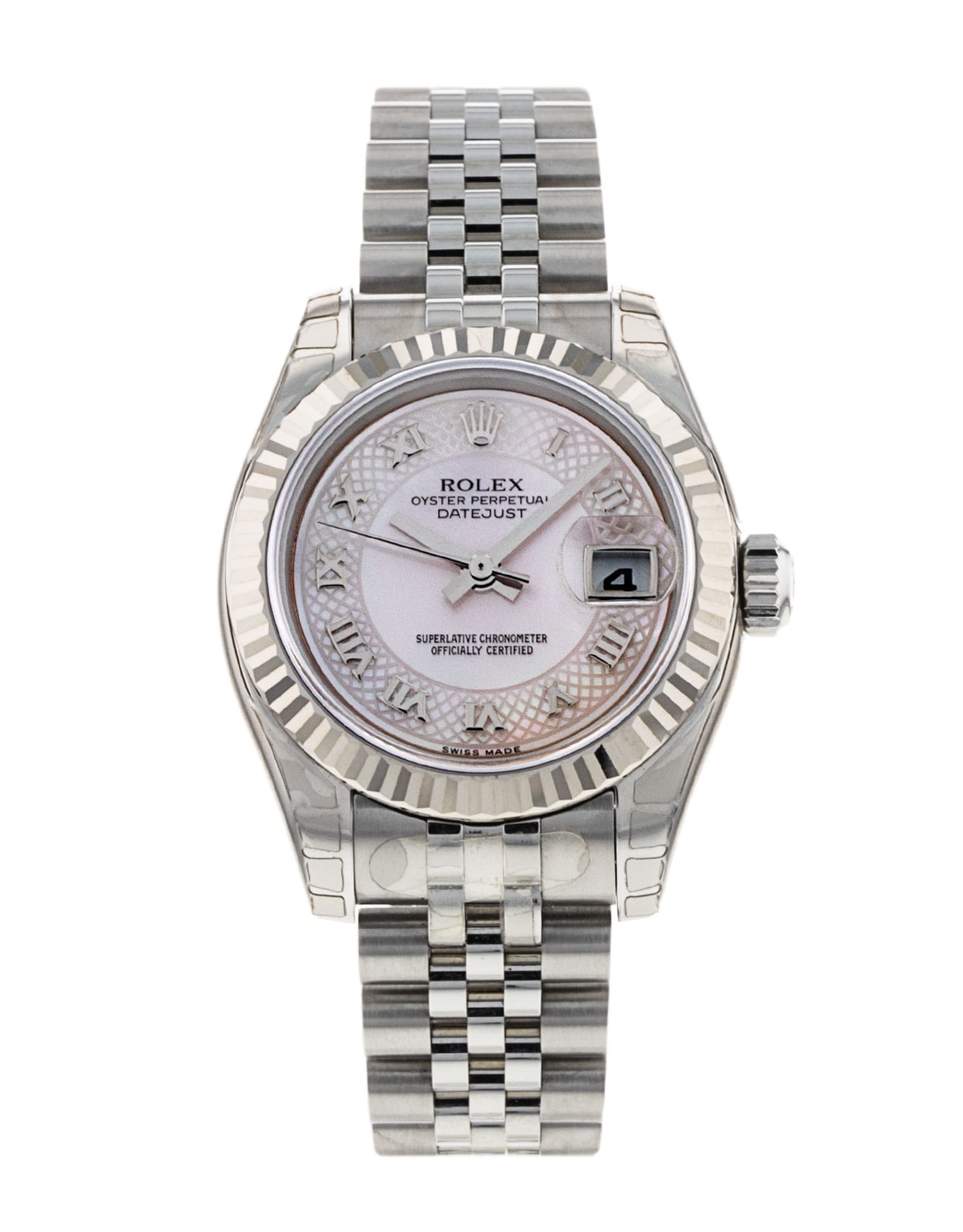 This Rolex Datejust Lady 179174 has a mother of pearl - myriad roman numeral dial and a bracelet strap. This Rolex has undergone a thorough inspection of water resistance, accuracy, functionality and condition to determine the level of reconditioning required to meet our strict standards. It has also been referenced against technical documents and manufacturer records where available to ensure authenticity and a clean history. All our watches have a 24-month warranty for your peace of mind. One of our skilled polishing technicians has removed marks on the case and bracelet of this watch, brought about by daily wear and tear, which is why this watch does not come with the remaining manufacturer’s warranty.