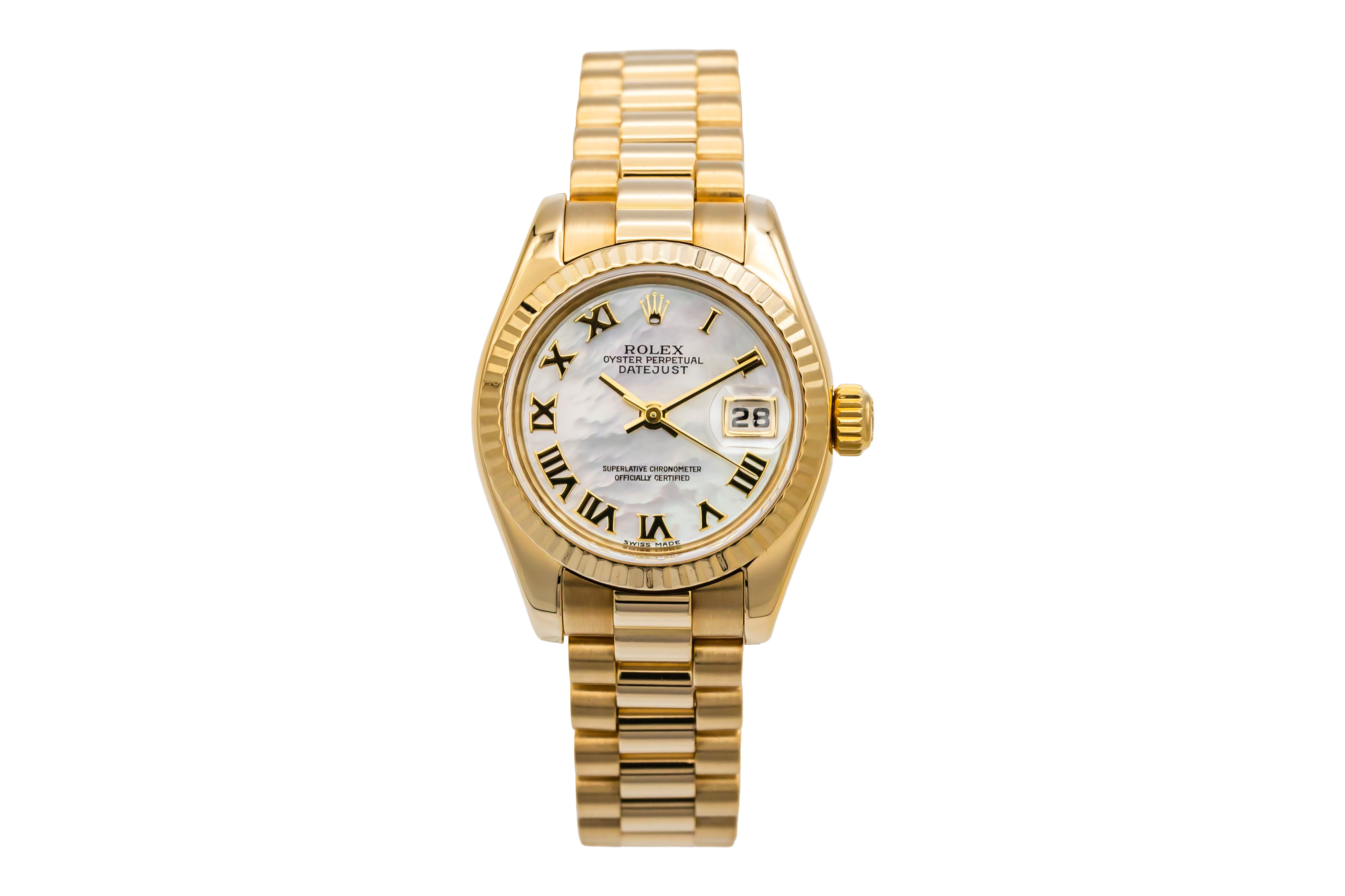 This Rolex Datejust Lady 179178 has a mother of pearl white roman numeral dial and a bracelet strap. This Rolex has undergone a thorough inspection of water resistance, accuracy, functionality and condition to determine the level of reconditioning required to meet our strict standards. It has also been referenced against technical documents and manufacturer records where available to ensure authenticity and a clean history. All our watches have a 24-month warranty for your peace of mind. One of our skilled polishing technicians has removed marks on the case and bracelet of this watch, brought about by daily wear and tear, which is why this watch does not come with the remaining manufacturer’s warranty.