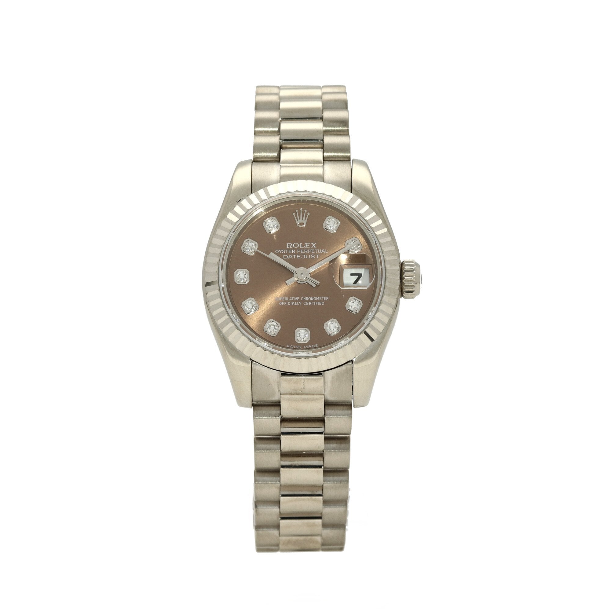 This Rolex Datejust Lady 179179 has a bronze diamond dial and a bracelet strap. This Rolex has undergone a thorough inspection of water resistance, accuracy, functionality and condition to determine the level of reconditioning required to meet our strict standards. It has also been referenced against technical documents and manufacturer records where available to ensure authenticity and a clean history. All our watches have a 24-month warranty for your peace of mind. One of our skilled polishing technicians has removed marks on the case and bracelet of this watch, brought about by daily wear and tear, which is why this watch does not come with the remaining manufacturer’s warranty.