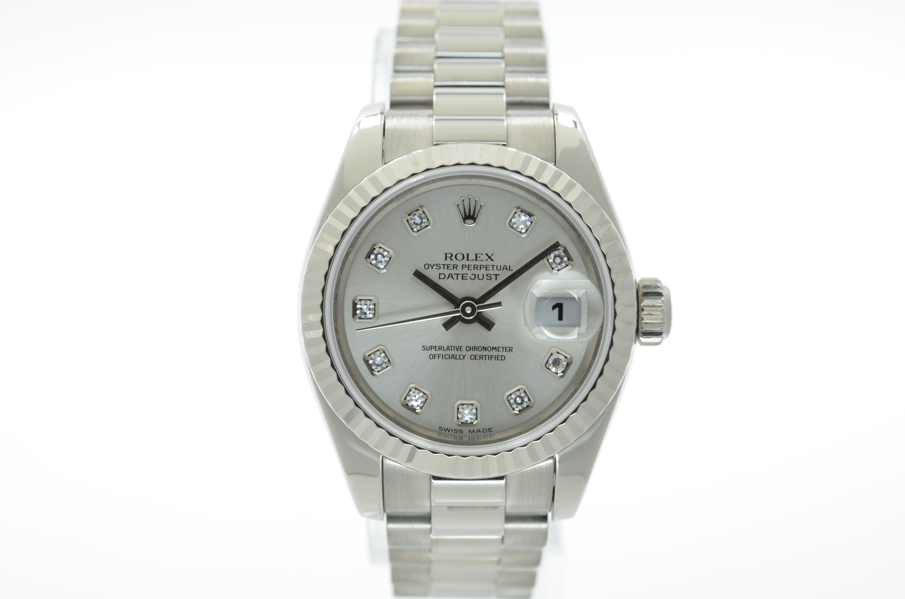 This Rolex Datejust Lady 179179 has a silver diamond dial and a bracelet strap. This Rolex has undergone a thorough inspection of water resistance, accuracy, functionality and condition to determine the level of reconditioning required to meet our strict standards. It has also been referenced against technical documents and manufacturer records where available to ensure authenticity and a clean history. All our watches have a 24-month warranty for your peace of mind. One of our skilled polishing technicians has removed marks on the case and bracelet of this watch, brought about by daily wear and tear, which is why this watch does not come with the remaining manufacturer’s warranty.