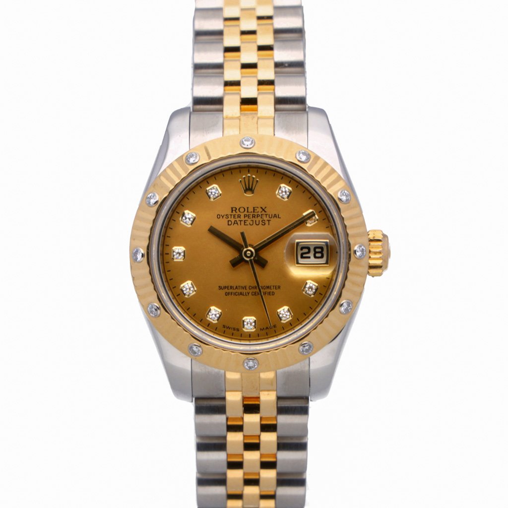 This Rolex Datejust Lady 179313 has a champagne diamond dial and a bracelet strap. This Rolex has undergone a thorough inspection of water resistance, accuracy, functionality and condition to determine the level of reconditioning required to meet our strict standards. It has also been referenced against technical documents and manufacturer records where available to ensure authenticity and a clean history. All our watches have a 24-month warranty for your peace of mind. One of our skilled polishing technicians has removed marks on the case and bracelet of this watch, brought about by daily wear and tear, which is why this watch does not come with the remaining manufacturer’s warranty.