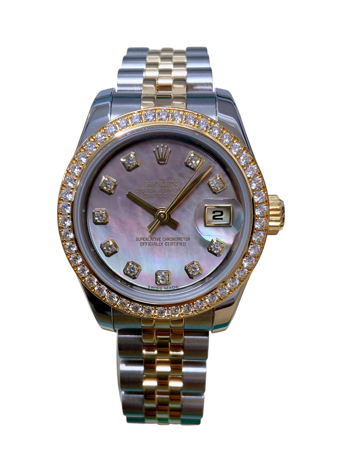 This Rolex Datejust Lady 179383 has a mother of pearl white - diamond dial and a bracelet strap. This Rolex has undergone a thorough inspection of water resistance, accuracy, functionality and condition to determine the level of reconditioning required to meet our strict standards. It has also been referenced against technical documents and manufacturer records where available to ensure authenticity and a clean history. Our watches have a 24-month warranty for your peace of mind, in conjunction with any remaining manufacturer’s warranty from new or from service. To maintain the manufacturer’s warranty on this watch, it has not been polished in our service centre.