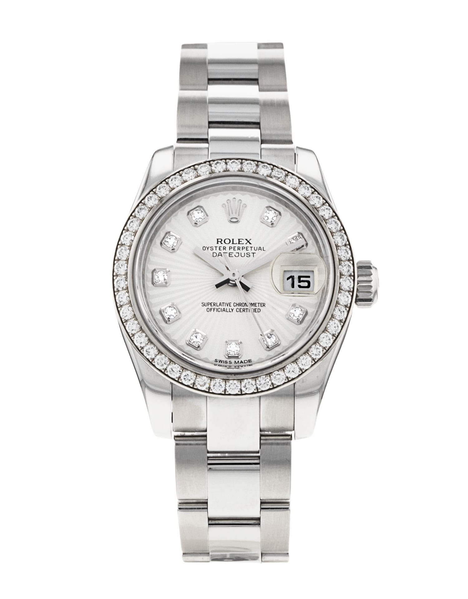 This Rolex Datejust Lady 179384 has a sunbeam diamond dial and a bracelet strap. This Rolex has undergone a thorough inspection of water resistance, accuracy, functionality and condition to determine the level of reconditioning required to meet our strict standards. It has also been referenced against technical documents and manufacturer records where available to ensure authenticity and a clean history. All our watches have a 24-month warranty for your peace of mind. One of our skilled polishing technicians has removed marks on the case and bracelet of this watch, brought about by daily wear and tear, which is why this watch does not come with the remaining manufacturer’s warranty.