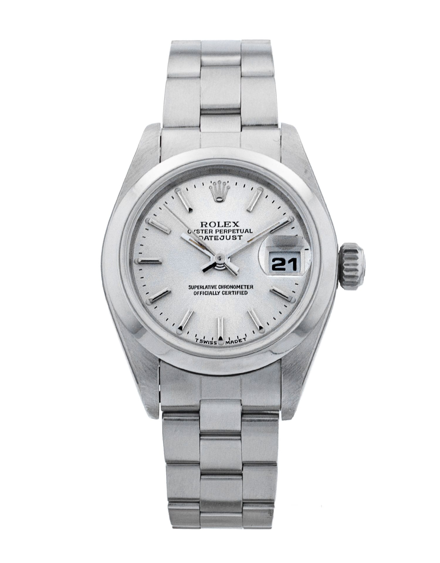 This Rolex Datejust Lady 69160 has a silver baton dial and a bracelet strap. This Rolex has undergone a thorough inspection of water resistance, accuracy, functionality and condition to determine the level of reconditioning required to meet our strict standards. It has also been referenced against technical documents and manufacturer records where available to ensure authenticity and a clean history. All our watches have a 24-month warranty for your peace of mind. One of our skilled polishing technicians has removed marks on the case and bracelet of this watch, brought about by daily wear and tear, which is why this watch does not come with the remaining manufacturer’s warranty.