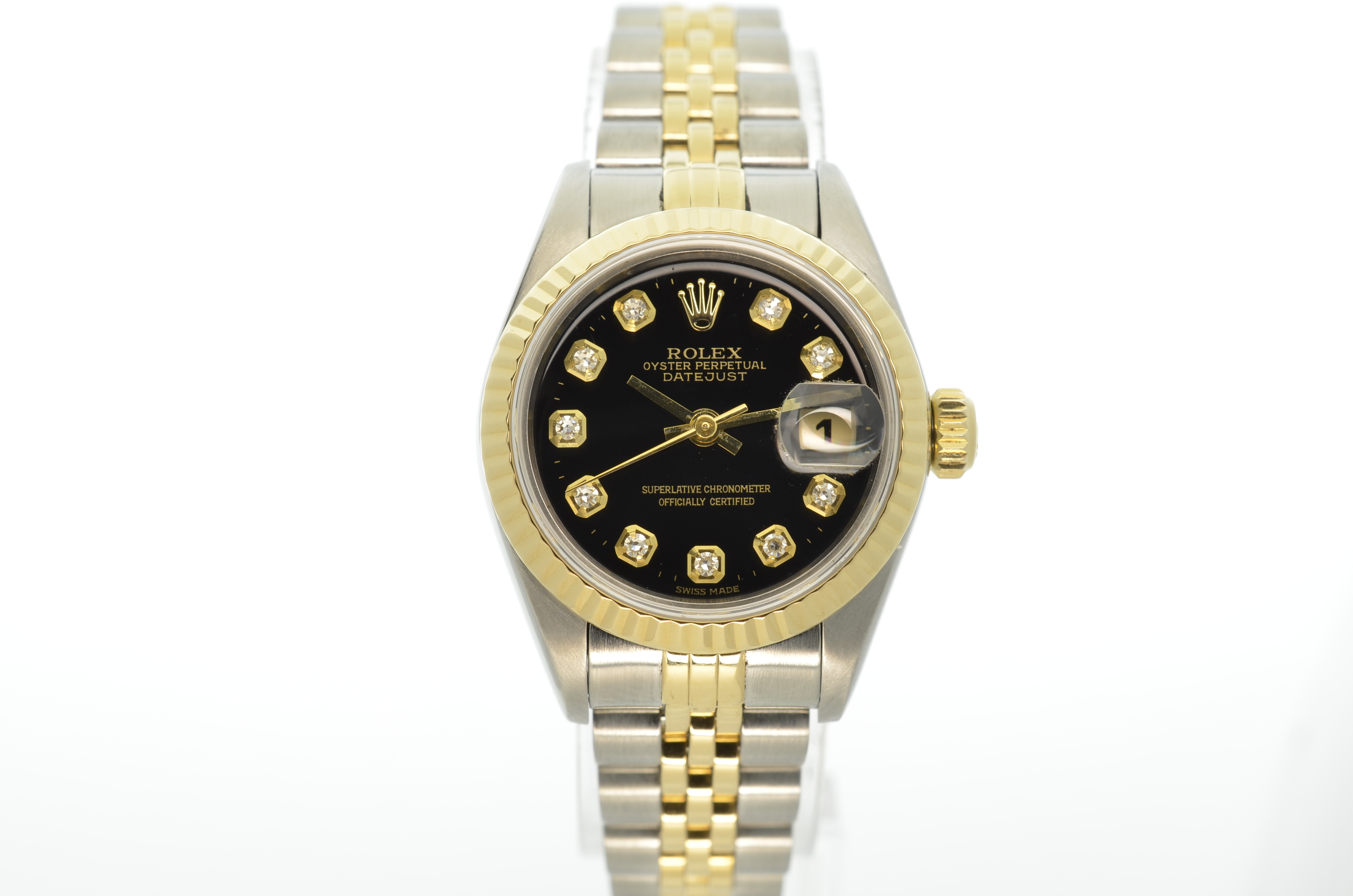 This Rolex Datejust Lady 69173 has a black diamond dial and a bracelet strap. This Rolex has undergone a thorough inspection of water resistance, accuracy, functionality and condition to determine the level of reconditioning required to meet our strict standards. It has also been referenced against technical documents and manufacturer records where available to ensure authenticity and a clean history. All our watches have a 24-month warranty for your peace of mind. One of our skilled polishing technicians has removed marks on the case and bracelet of this watch, brought about by daily wear and tear, which is why this watch does not come with the remaining manufacturer’s warranty.