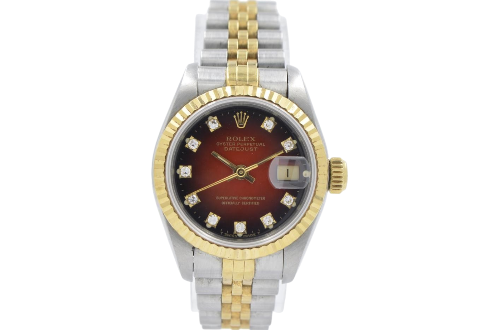 This Rolex Datejust Lady 69173 has a red degraded diamond dial and a bracelet strap. This Rolex has undergone a thorough inspection of water resistance, accuracy, functionality and condition to determine the level of reconditioning required to meet our strict standards. It has also been referenced against technical documents and manufacturer records where available to ensure authenticity and a clean history. All our watches have a 24-month warranty for your peace of mind. One of our skilled polishing technicians has removed marks on the case and bracelet of this watch, brought about by daily wear and tear, which is why this watch does not come with the remaining manufacturer’s warranty.