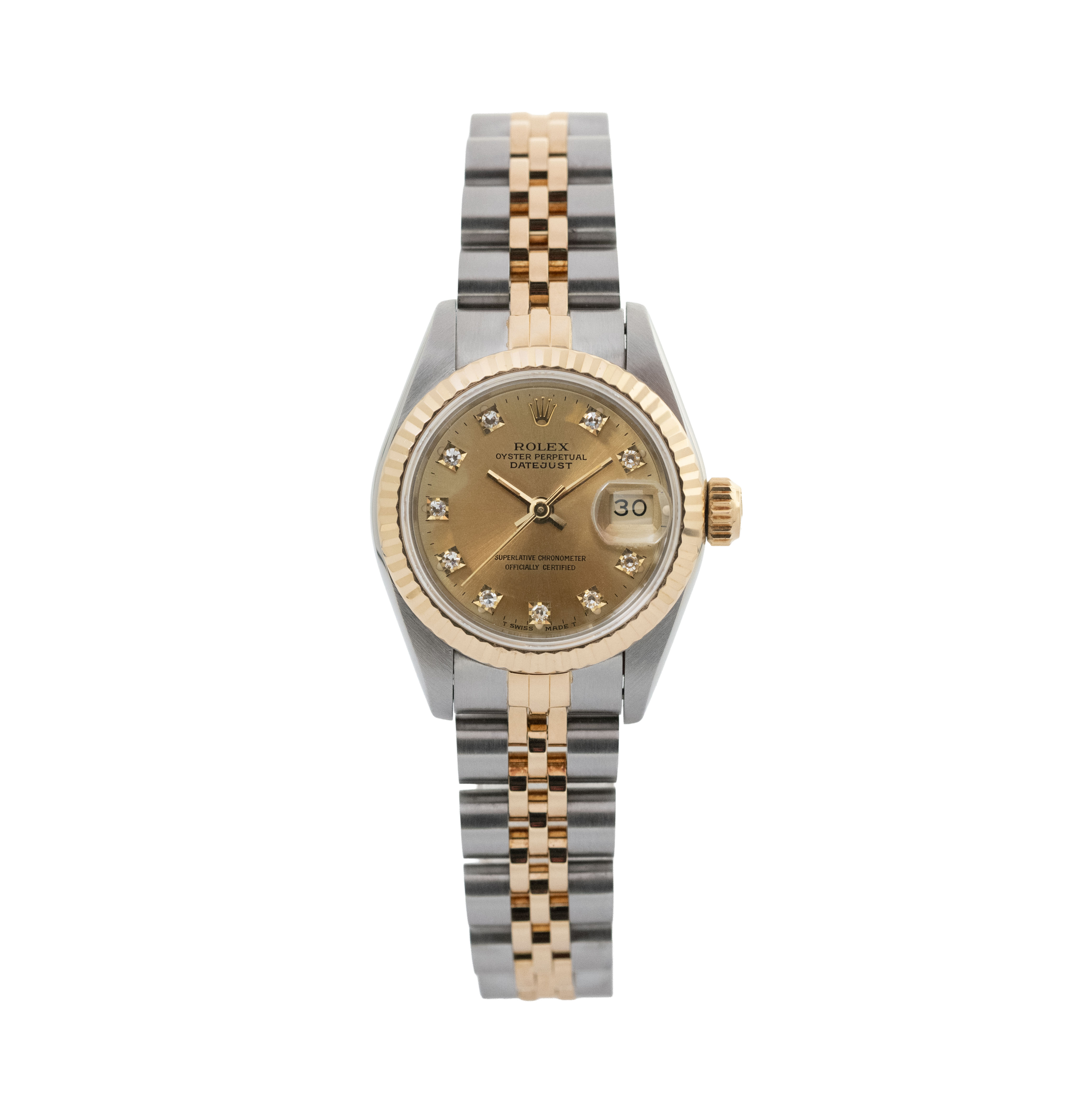 This Rolex Datejust Lady 69173 has a champagne diamond dial and a bracelet strap. This Rolex has undergone a thorough inspection of water resistance, accuracy, functionality and condition to determine the level of reconditioning required to meet our strict standards. It has also been referenced against technical documents and manufacturer records where available to ensure authenticity and a clean history. All our watches have a 24-month warranty for your peace of mind. One of our skilled polishing technicians has removed marks on the case and bracelet of this watch, brought about by daily wear and tear, which is why this watch does not come with the remaining manufacturer’s warranty.