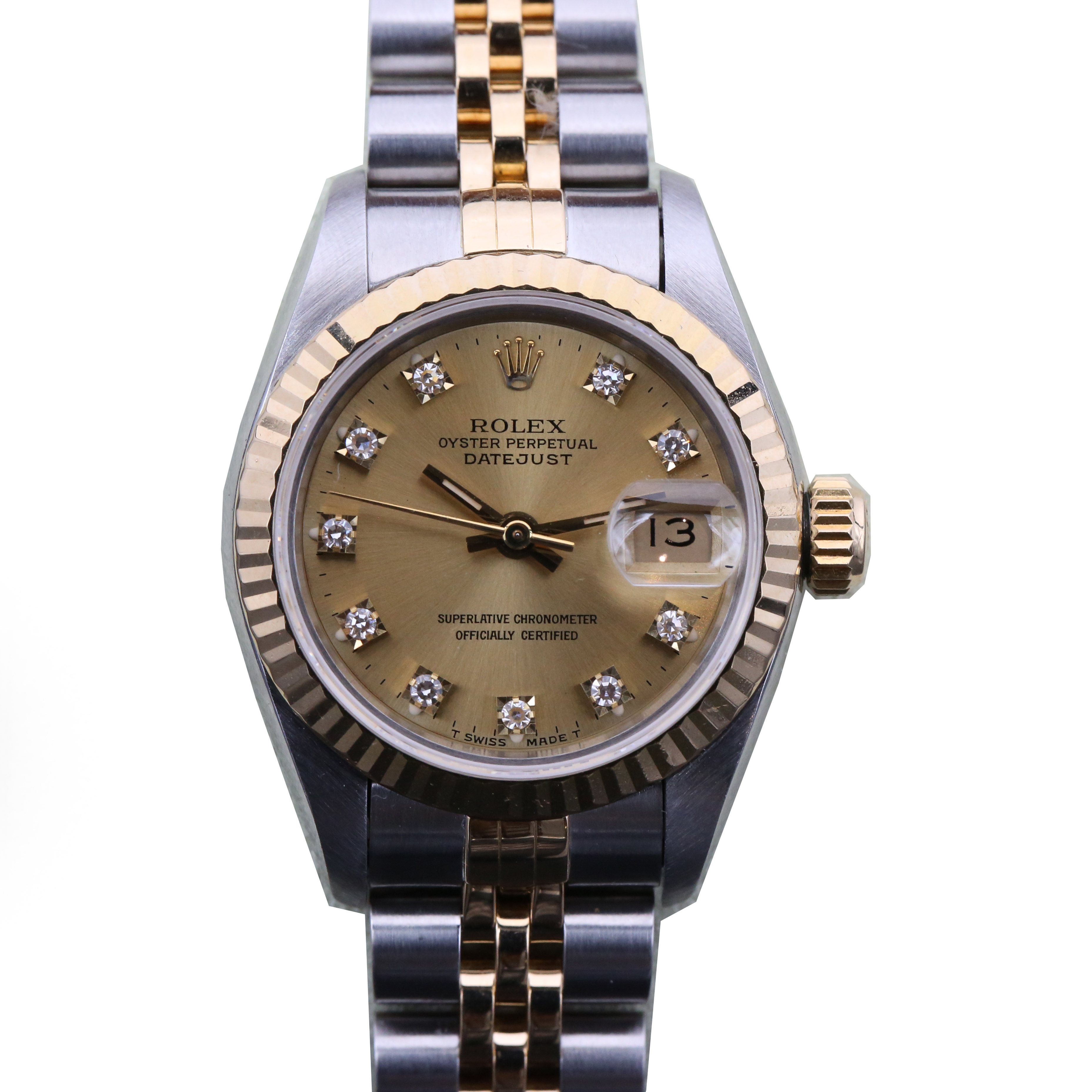 This Rolex Datejust Lady 69173 has a champagne diamond dial and a bracelet strap. This Rolex has undergone a thorough inspection of water resistance, accuracy, functionality and condition to determine the level of reconditioning required to meet our strict standards. It has also been referenced against technical documents and manufacturer records where available to ensure authenticity and a clean history. All our watches have a 24-month warranty for your peace of mind. One of our skilled polishing technicians has removed marks on the case and bracelet of this watch, brought about by daily wear and tear, which is why this watch does not come with the remaining manufacturer’s warranty.